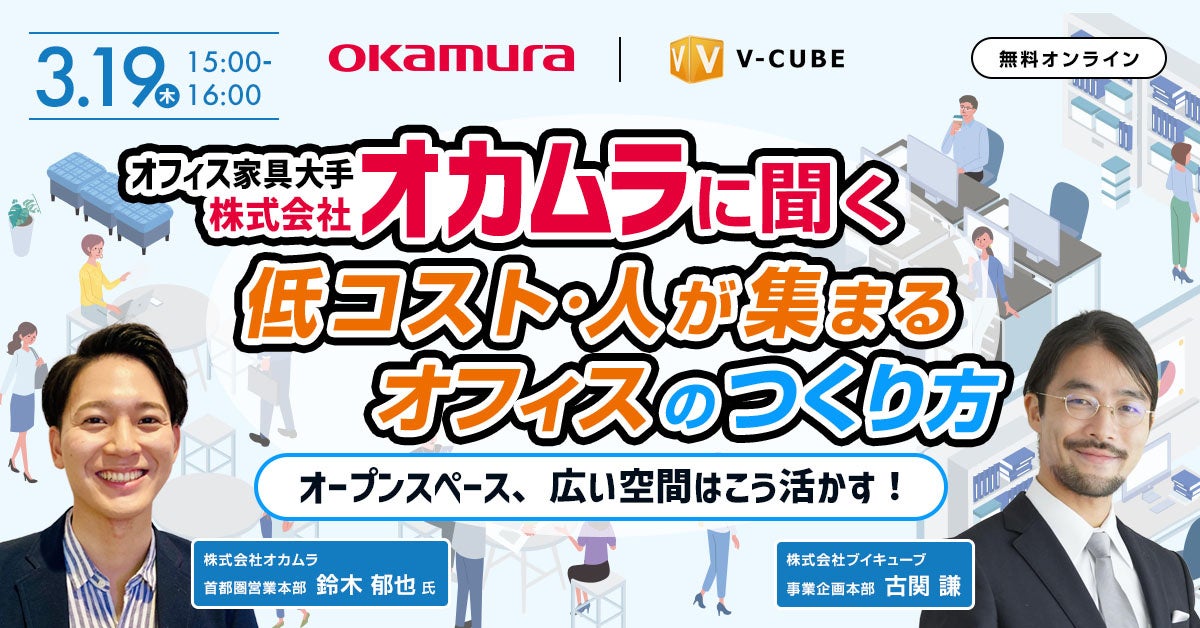 株式会社ブイキューブ(本社:東京都港区、代表取締役社長 グループCEO:間下 直晃、以下 ブイキューブ)は、株式会社オカムラ(本社:神奈川県横浜市、代表取締役 社長執行役員:中村 雅行)からゲストを迎え、2026年3月19日(木)15時より、無料オンラインセミナー「オカムラに聞く、『低コスト・人が集まるオフィス』のつくり方」を開催いたします。