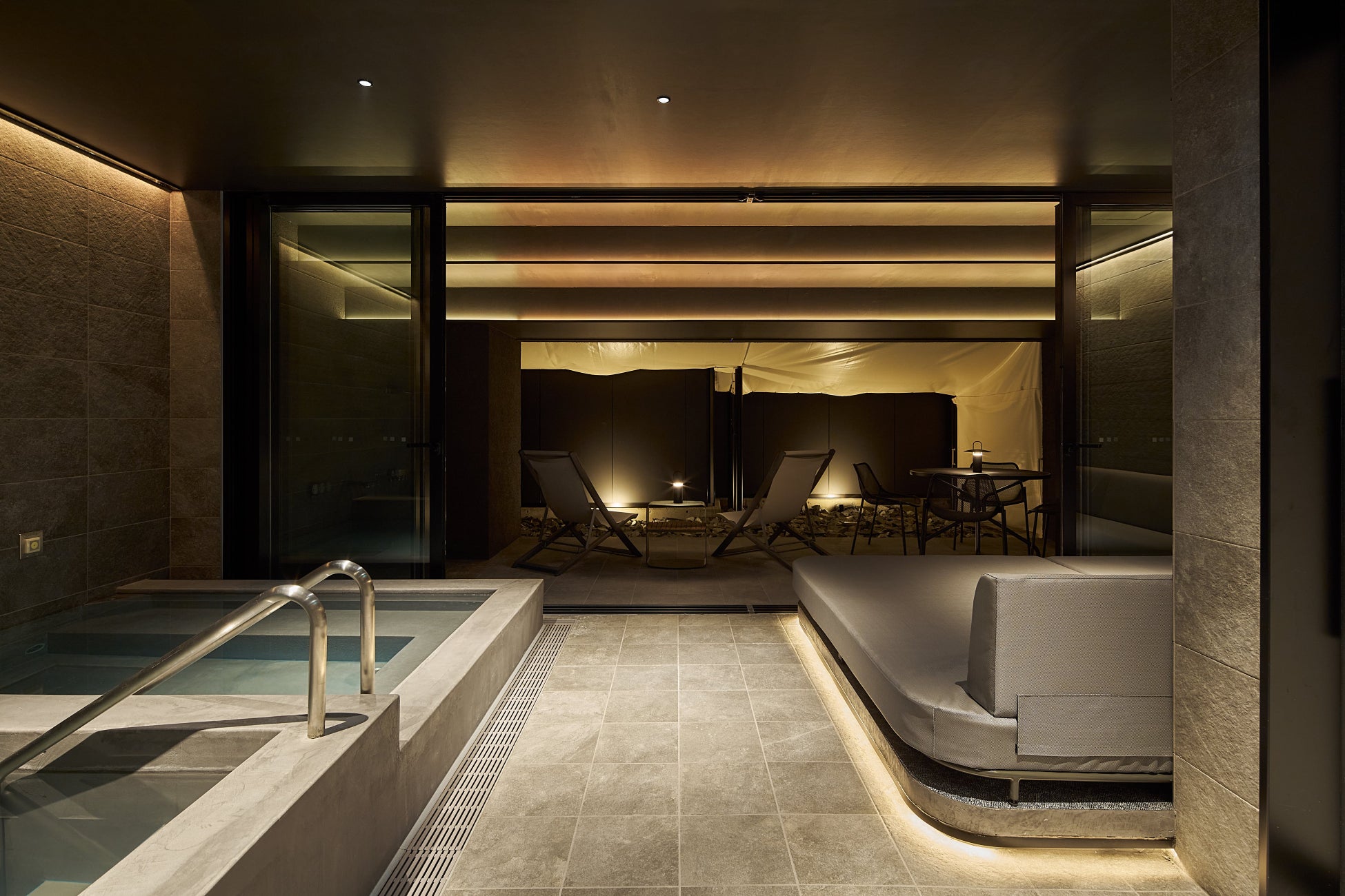サウナのために開発された人工石のケルケスストーンを使用したフィンランド式と、ベンチ下にヒーターを設置したモリス式の世界でも珍しいハイブリッドサウナに、深さ90cmの水風呂、外気浴のできるテラスを完備。