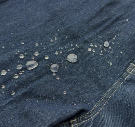 ※) ※一般的なデニムは10.0oz程度(283.5g/M2)に対して撥水デニムは6.7oz(190g/M2)