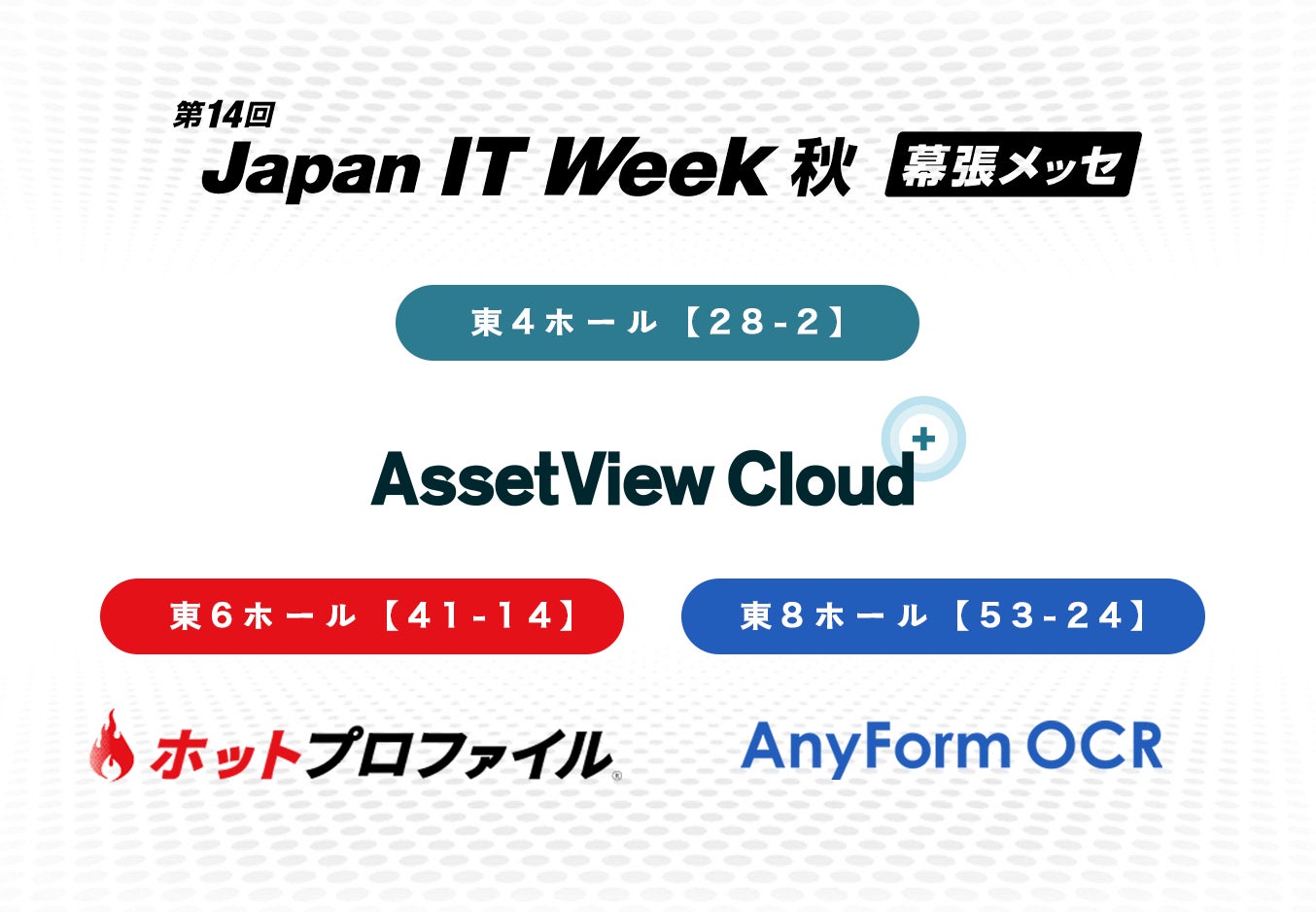 弊社は、統合型IT運用管理「AssetView」、名刺管理・営業支援ツール「ホットプロファイル」、帳票・注文書・請求書・伝票の電子データ化ツール「AnyForm OCR」にて出展いたします。