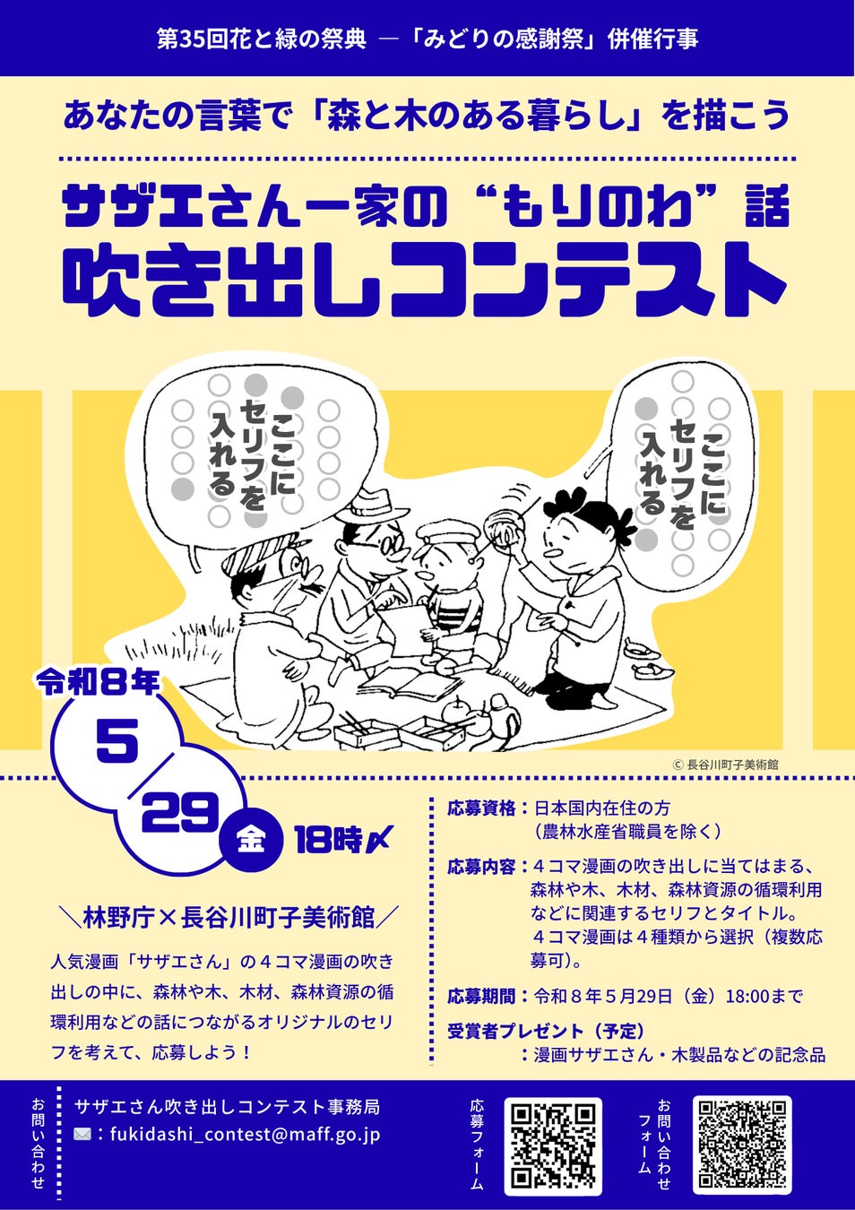 林野庁は、森林資源の循環利用について国民の皆さんに考えていただくため、「サザエさん一家の“もりのわ”話吹き出しコンテスト2026」を開催し、広く作品を募集します。