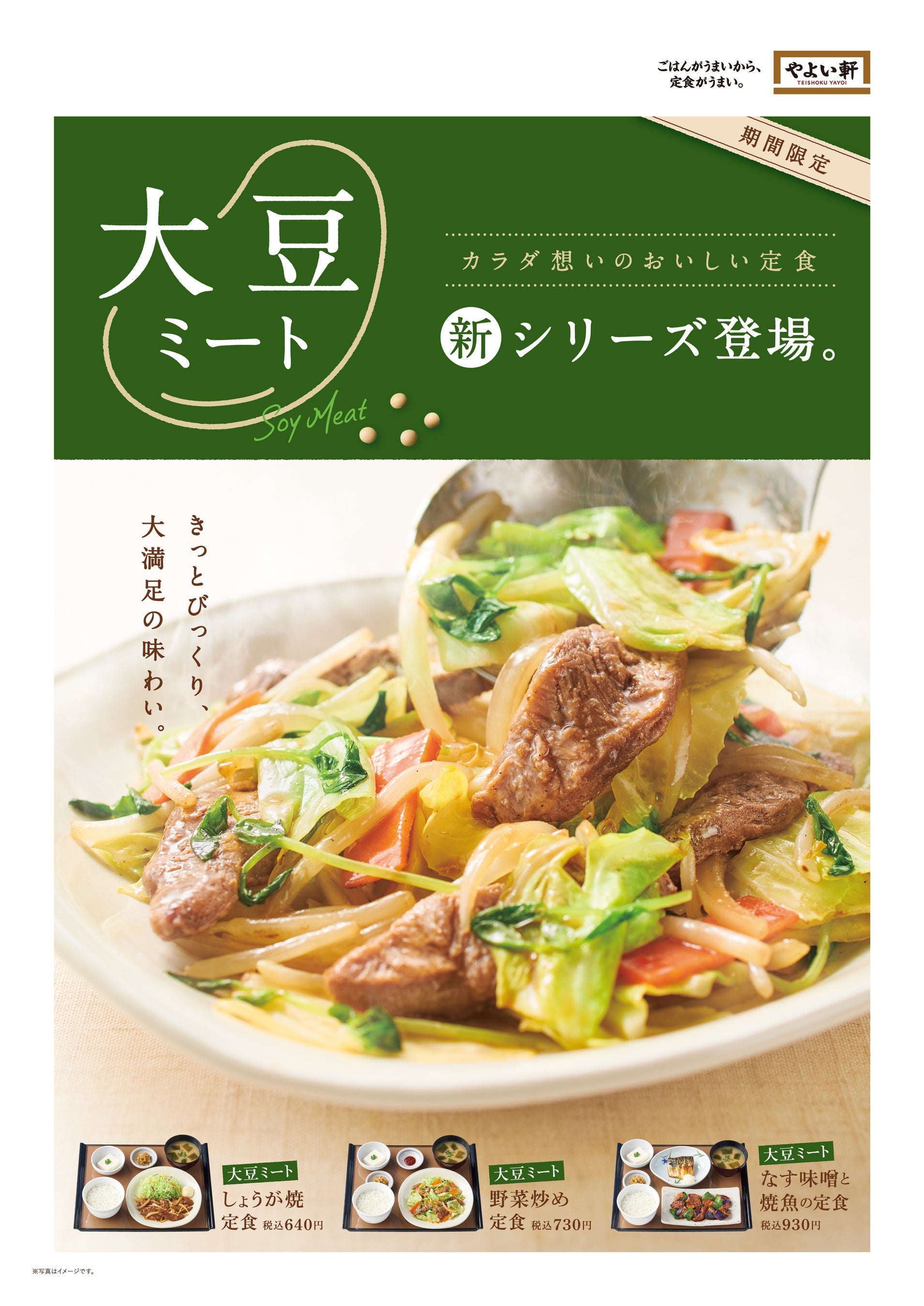 「やよい軒」史上初!100%植物性の次世代肉を使用『大豆ミートの野菜炒め定食』『大豆ミートのしょうが焼定食』『大豆ミートのなす味噌と焼魚の定食』6月14日(火)新発売