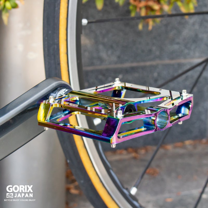 装着すると自転車が一段とかっこよくなるオイルスリックカラーのフラットペダル。