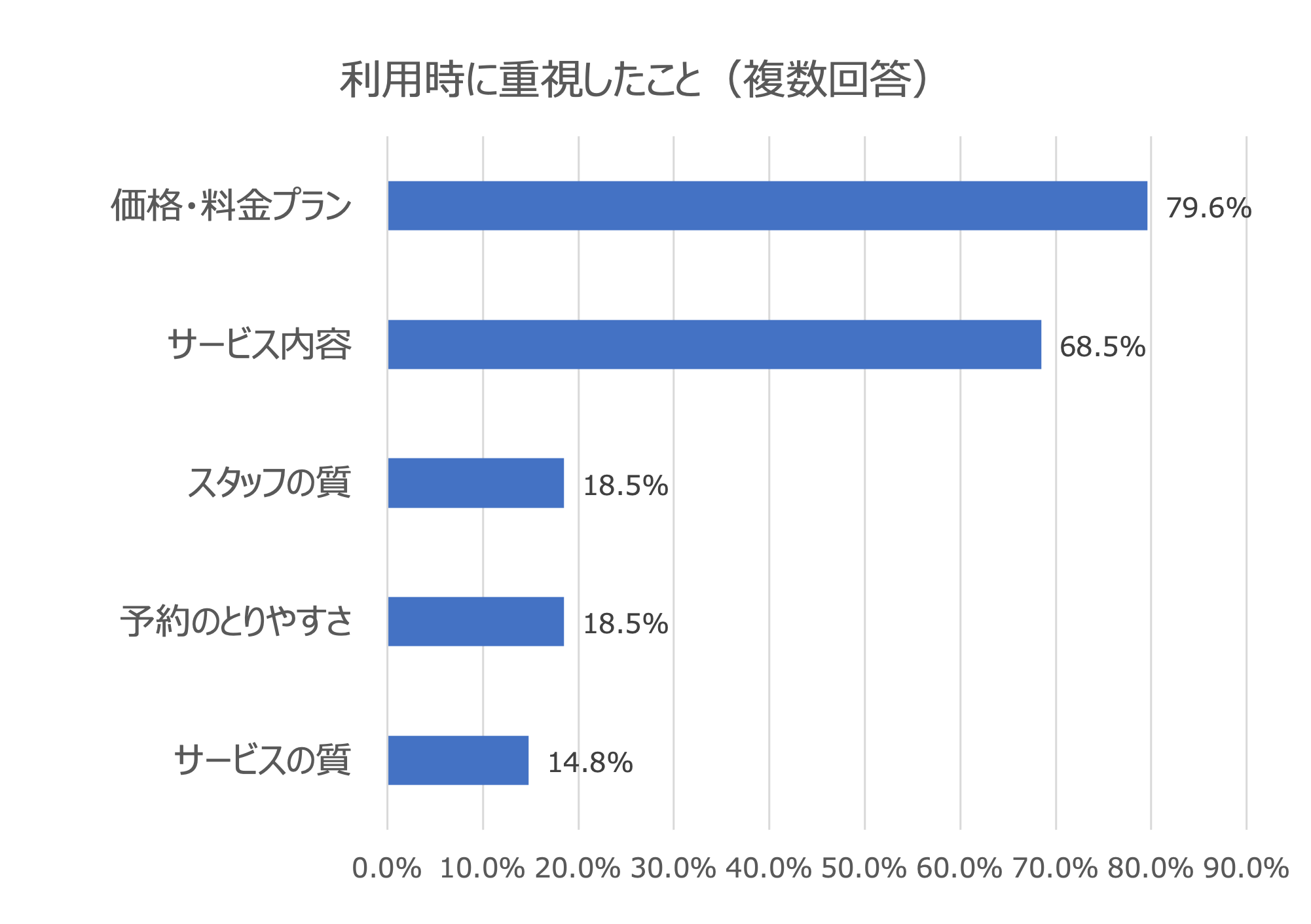 利用の際に重視したことは「価格・料金プラン」が79.6%と最も多く、「サービス内容」「スタッフの質」「予約のとりやすさ」「サービスの質」と続きました(上記グラフ、複数回答)。