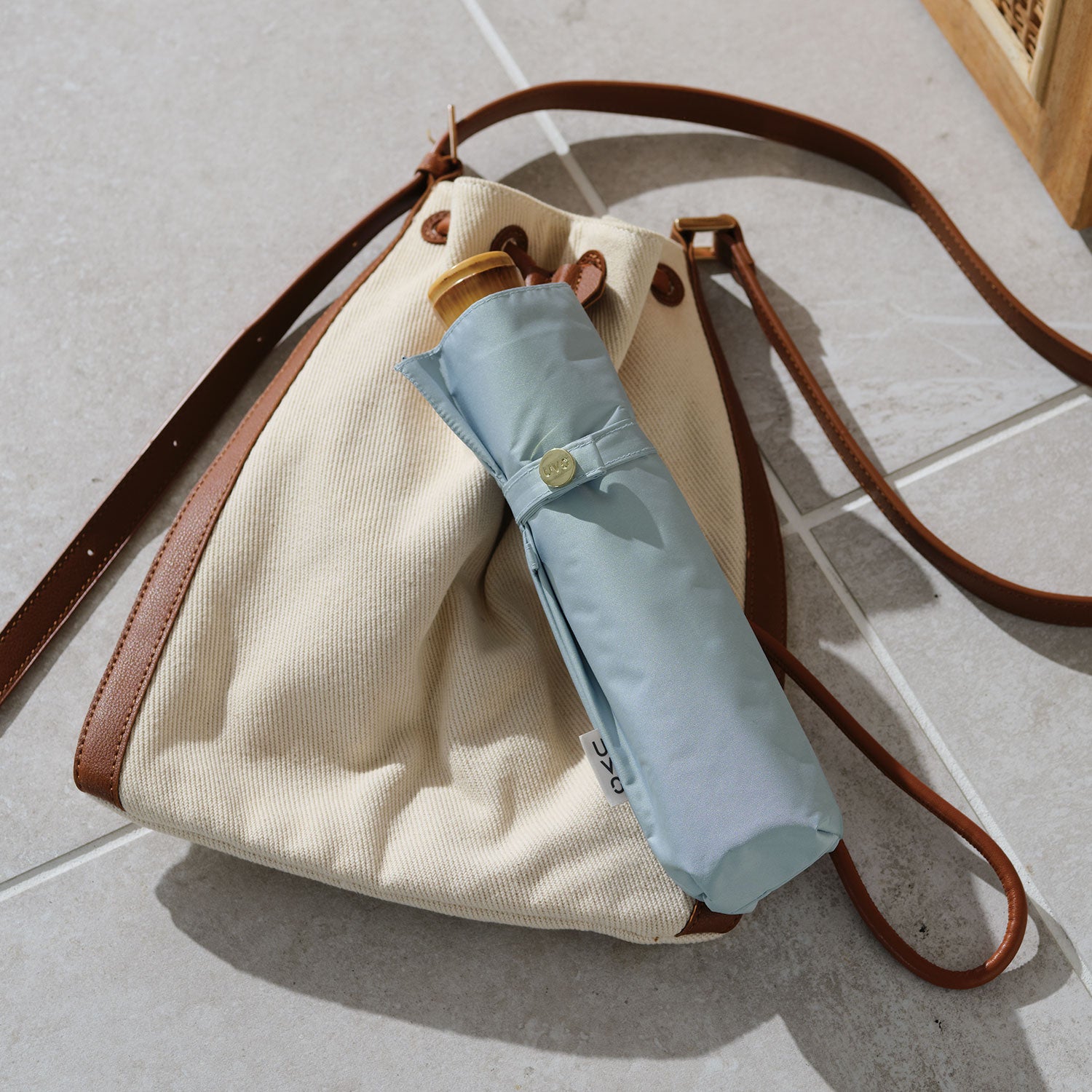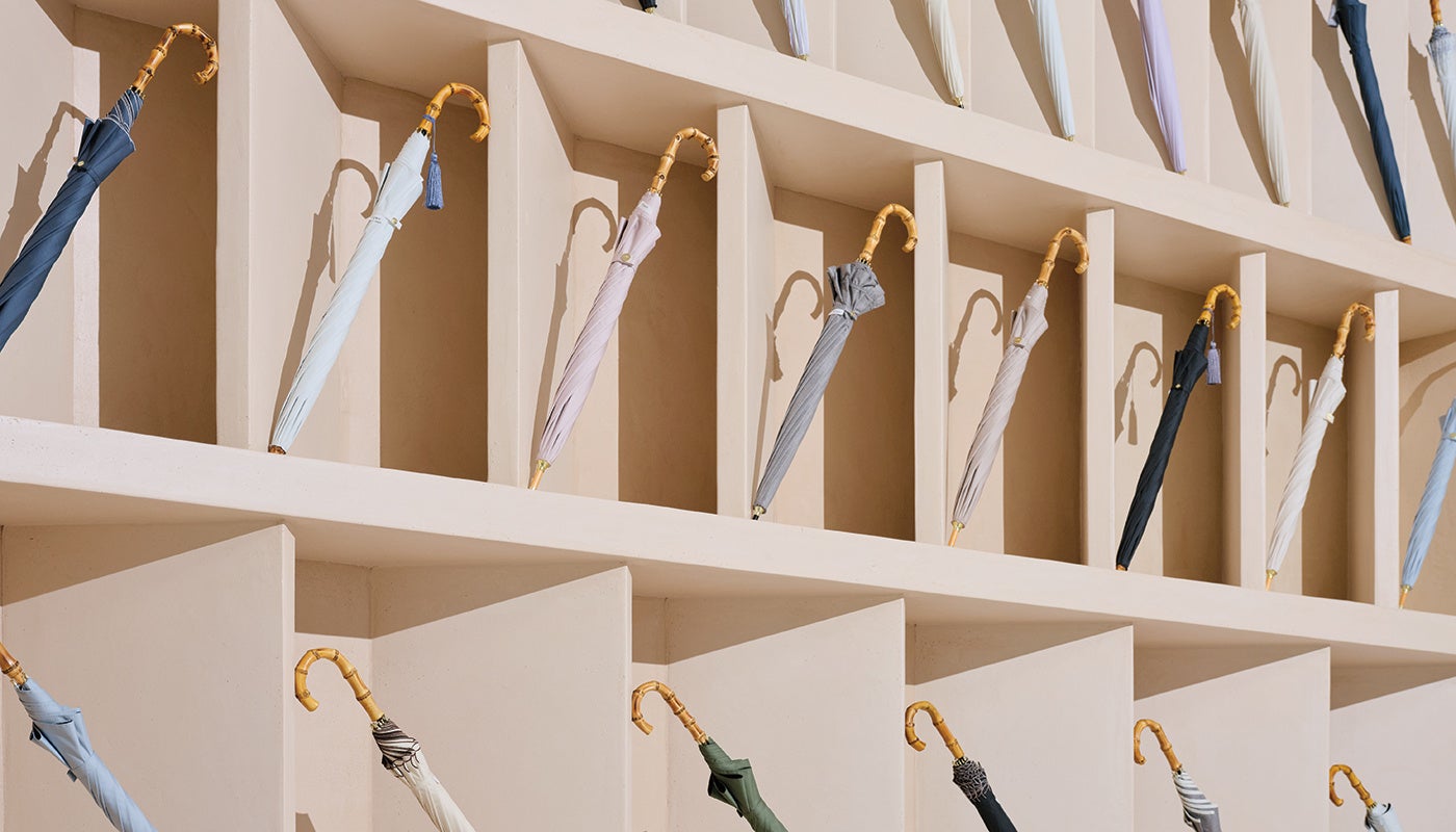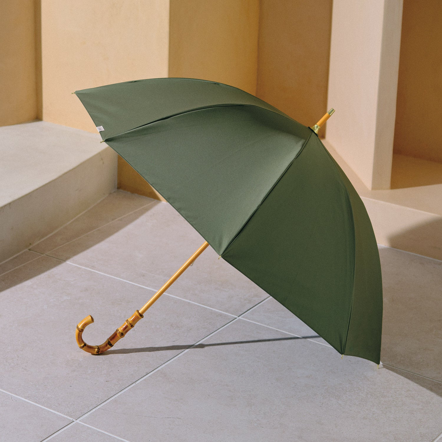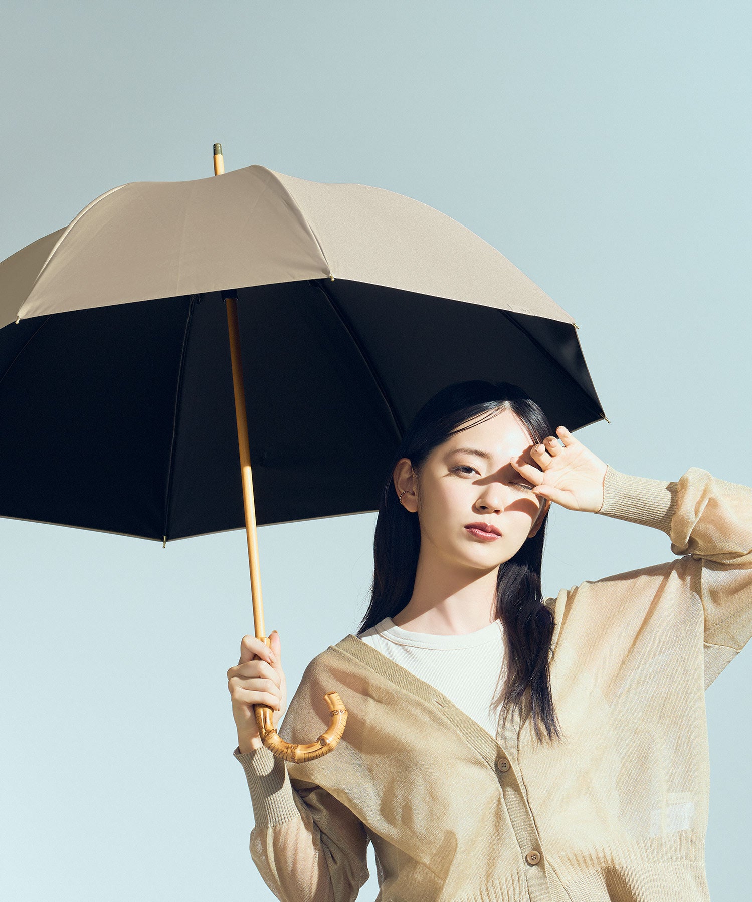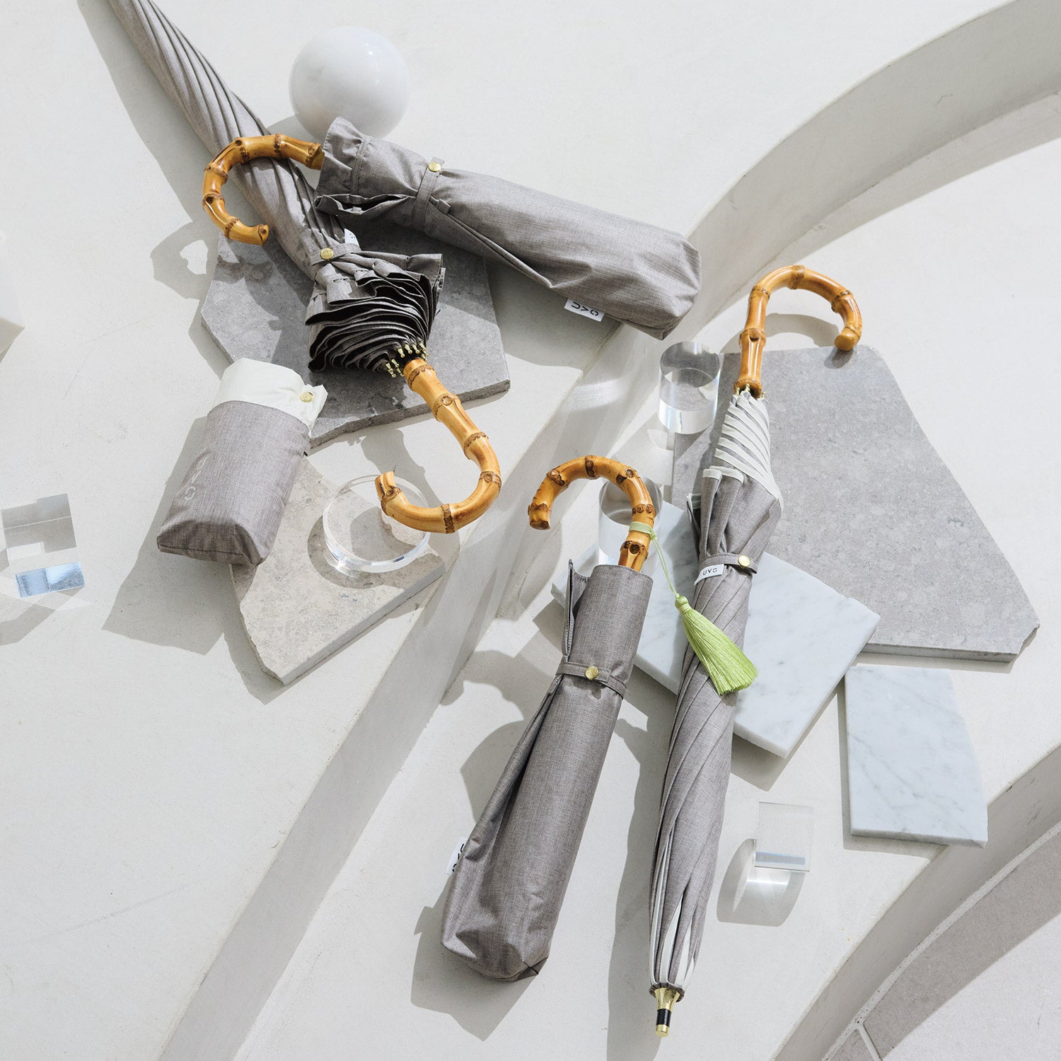 “穏やかな、落ち着いた”という意味を持つ「CALM」。自然をイメージした上品で優しいカラー展開が特徴のCALMシリーズは、肌なじみの良いベージュ、落ち着きのあるブルー、コーディネートを引き締めるブラックなど、オールシーズン使いやすい全7色です。長傘の中棒の素材には木を使用し、生地は光沢と厚みをもたせることで高級感のある仕上がりに。また「持ち手までバッグに収まるサイズが欲しい」というお客様のご要望にお応えし、折りたたみ傘3段折の持ち手には小ぶりなバンブー持ち手を採用しました。
