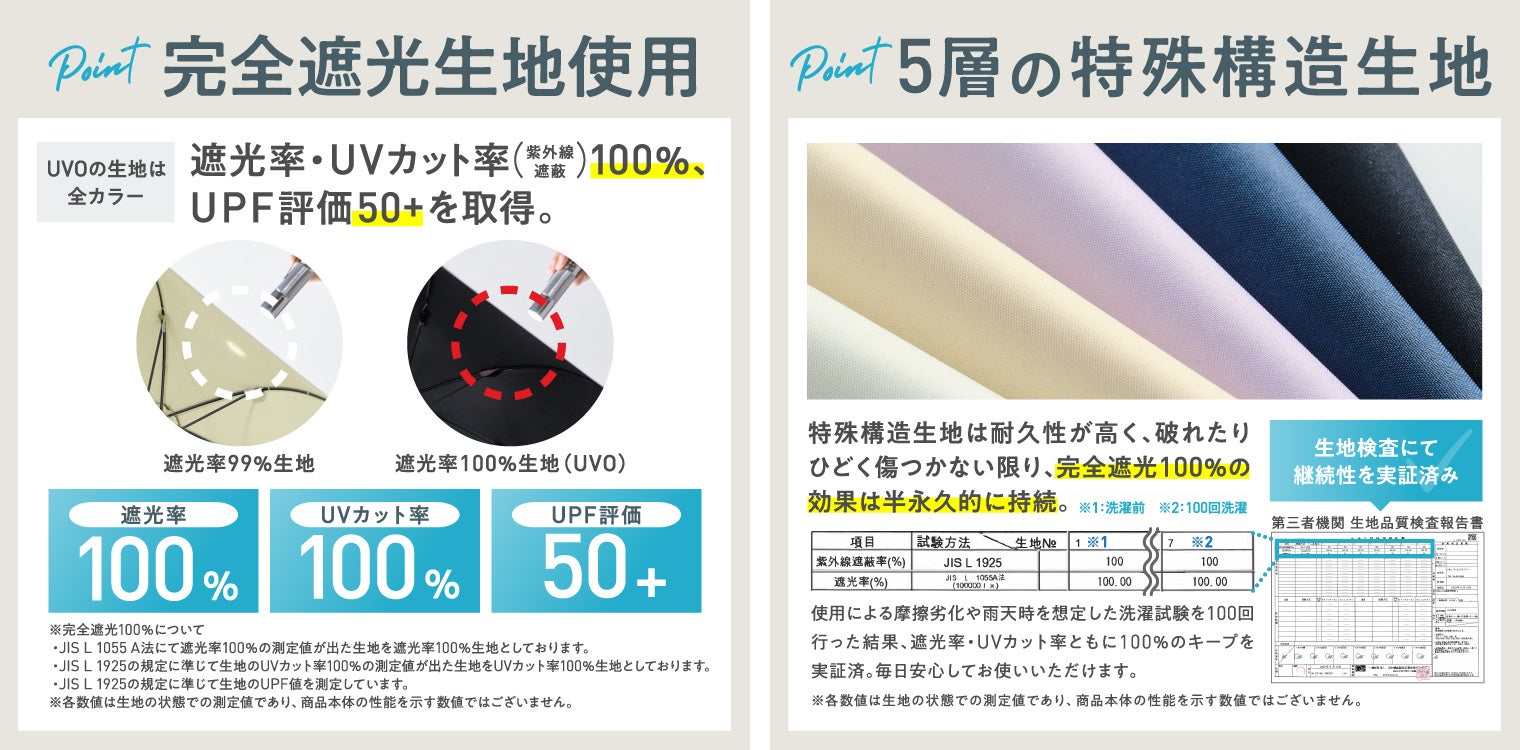 UVOの5層の特殊構造生地は全カラー遮光率100%・UVカット率100%、UPF50+を取得しており、夏の強い日差しや1年を通して降り注ぐ紫外線をしっかりブロック。破れたり、ひどく傷つかない限り、完全遮光100%の効果が半永久的に持続する耐久性の高さも魅力。生地品質検査でもその継続性が実証されています。