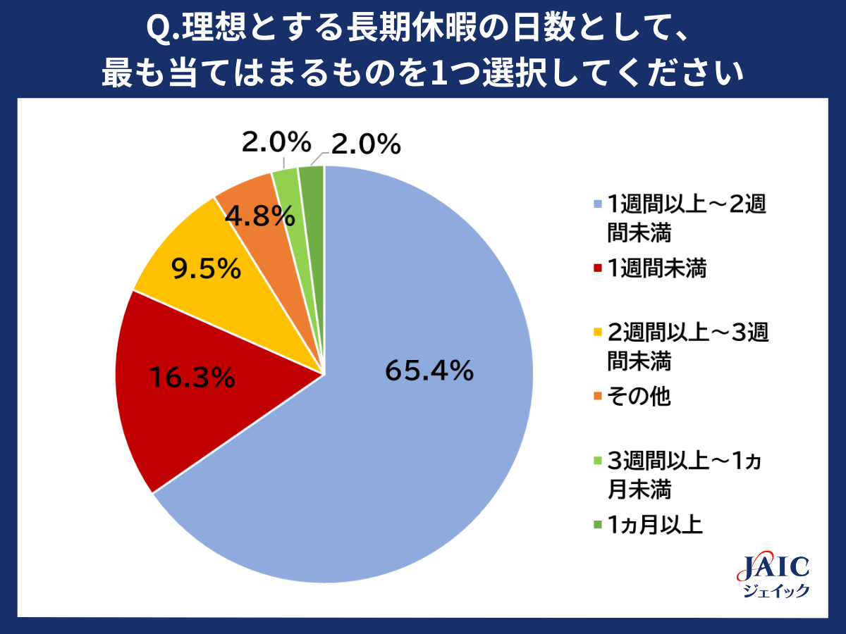 「理想とする長期休暇の日数として、最も当てはまるものを1つ選択してください。」と質問したところ、「1週間以上~2週間未満」が65.4%、「1週間未満」が16.3%、「2週間以上~3週間未満」が9.5%、「その他」が4.8%、「3週間以上~1ヵ月未満」「1ヵ月以上」が同率で2.0%となりました。