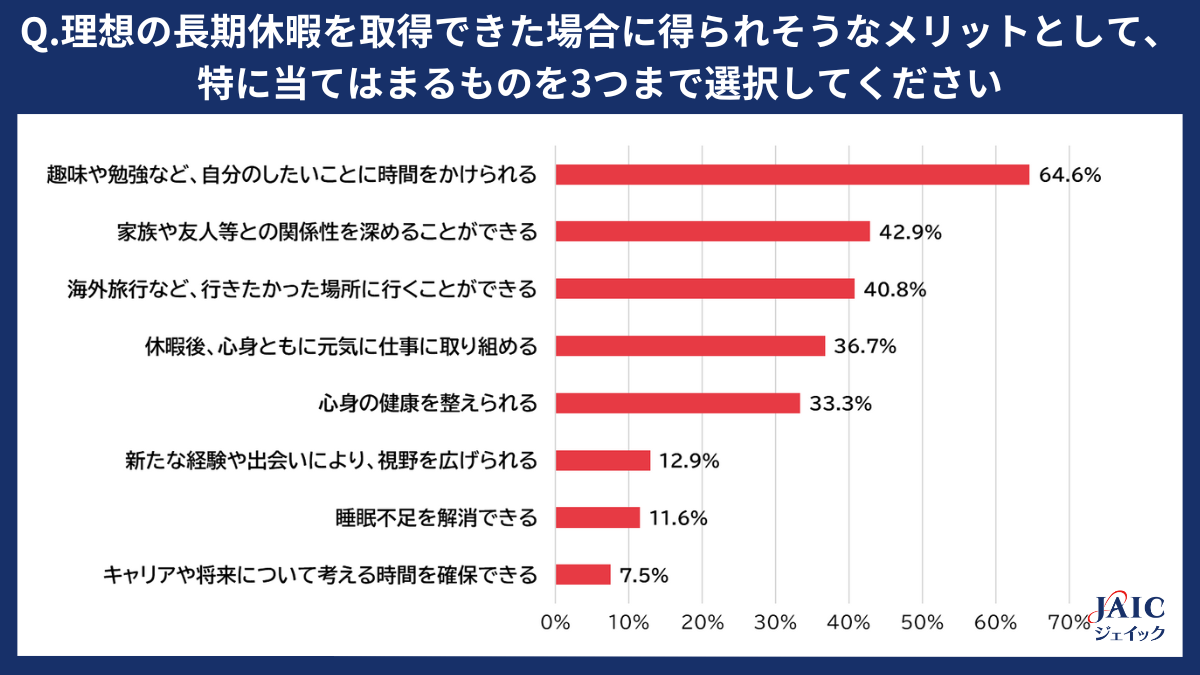「理想の長期休暇を取得できた場合に得られそうなメリットとして、特に当てはまるものを3つまで選択してください」と質問したところ、1位~3位は「趣味や勉強など、自分のしたいことに時間をかけられる」、「家族や友人等との関係性を深めることができる」、「海外旅行など、行きたかった場所に行くことができる」となり、長期休暇を、自身がやりたいと思うことや身近な人と過ごす時間に活用したいという傾向が見受けられました。
