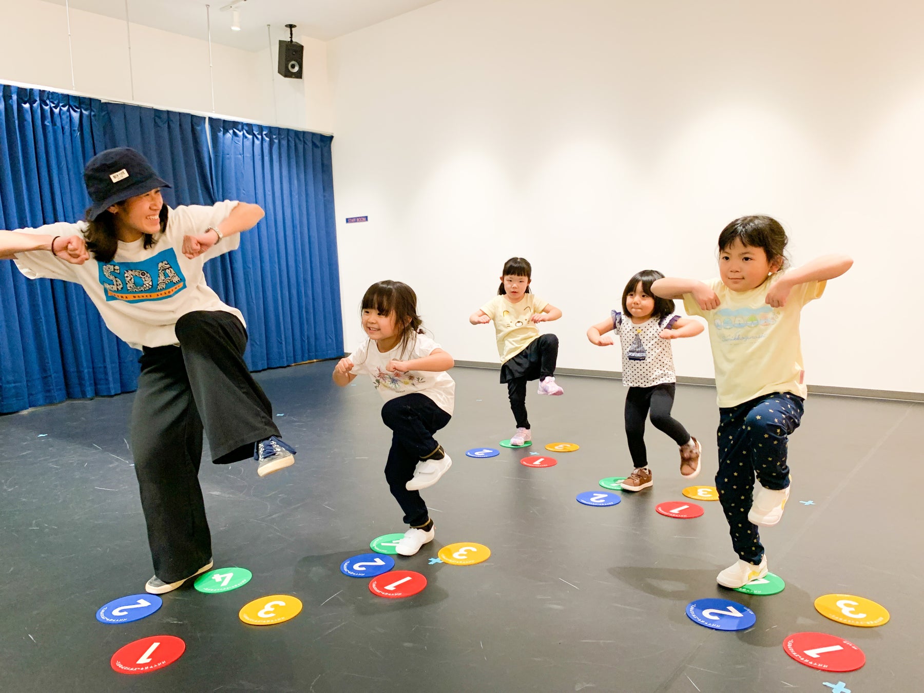 セイハダンスアカデミーはパパイヤ鈴木氏が生みだした「パパイヤ式」メソッドを導入しています。マットを使って体を動かし、リズム感や表現力を楽しく身につけることができます。ヒップホップやジャズ、ロックなどダンスを中⼼に、楽しみながら自然とリズム感・基礎体力を養えるカリキュラムです。パパイヤ鈴⽊⽒が⽣み出したメソッドは、1から4の数字が書かれた「カズフミくんマット」を順に踏んでいくだけで、誰もが簡単に踊れるように設計されています。ダンスに最も⼤切な基礎スキルである、下半⾝の体重移動が⾃然と⾝につく、まさにダンスの譜⾯のようなもの、それがカズフミくんなのです。