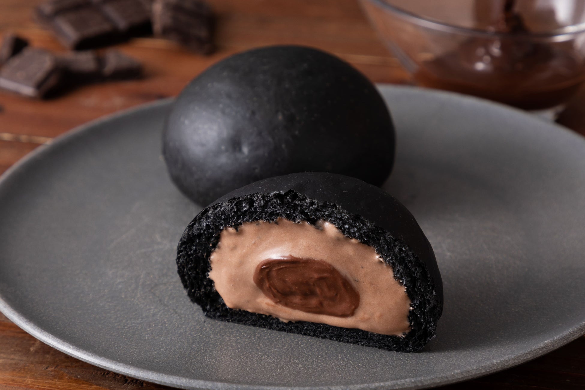 しっとりふんわりした真っ黒な生地の中に、ミルクチョコレートクリームと、中心には生チョコレートを使用した濃厚ショコラクリームを入れました。