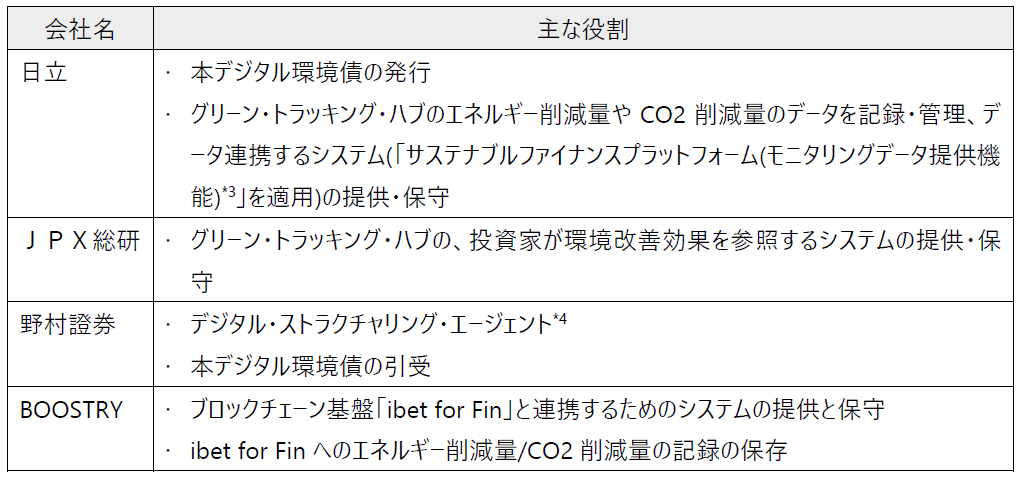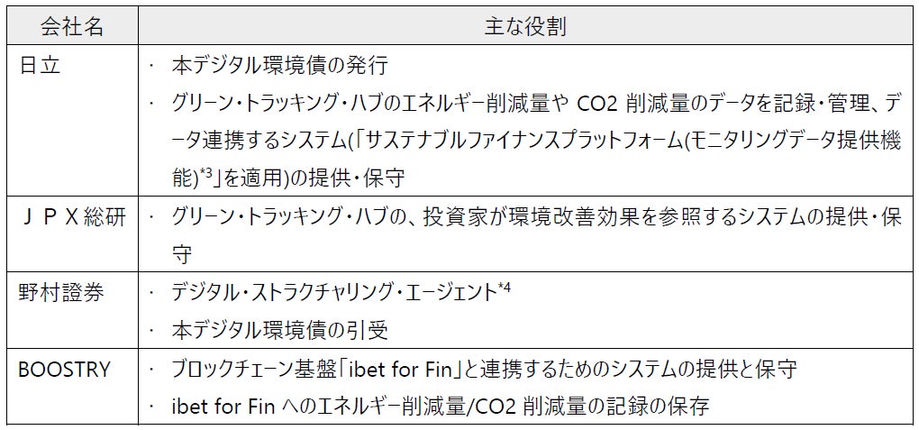 株式会社日立製作所(以下、日立)、株式会社JPX総研(以下、JPX総研)、野村證券株式会社(以下、野村證券)および株式会社BOOSTRY(以下、BOOSTRY)は、日立による、IoTやブロックチェーン基盤などのデジタル技術を用いた「グリーン・デジタル・トラック・ボンド(以下、デジタル環境債)」の発行に向けて、協業をします。なお、発行条件については決定次第お知らせします。
