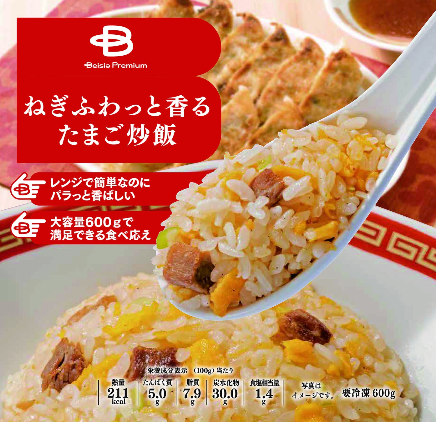 レンジ調理で簡単にパラッと香ばしい炒飯が楽しめます。たまご・ねぎ・焼豚に黒こしょうをアクセントにし、“シンプルだけど何度も食べたくなる町中華”をイメージした炒飯で、餃子などの中華系おかずとの相性も抜群。600gと大容量なので、満足できる食べごたえです。