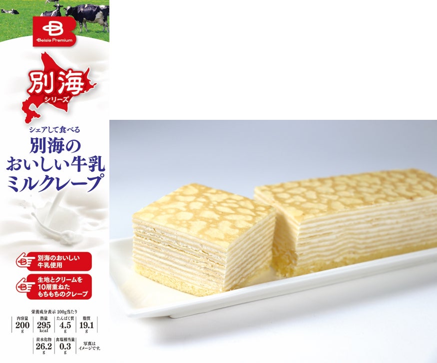 当社で大人気、「別海のおいしい牛乳」シリーズに冷凍スイーツの新作が登場しました。牛乳のもつ濃厚かつスッキリとした味わいを活かしてつくったクリームを、しっとりもちもちの食感にこだわって丁寧に焼き上げたクレープ生地で織り込み、10層に重ねました。食べる分だけカットして解凍できるので、いつでも好きなときに味わえます。