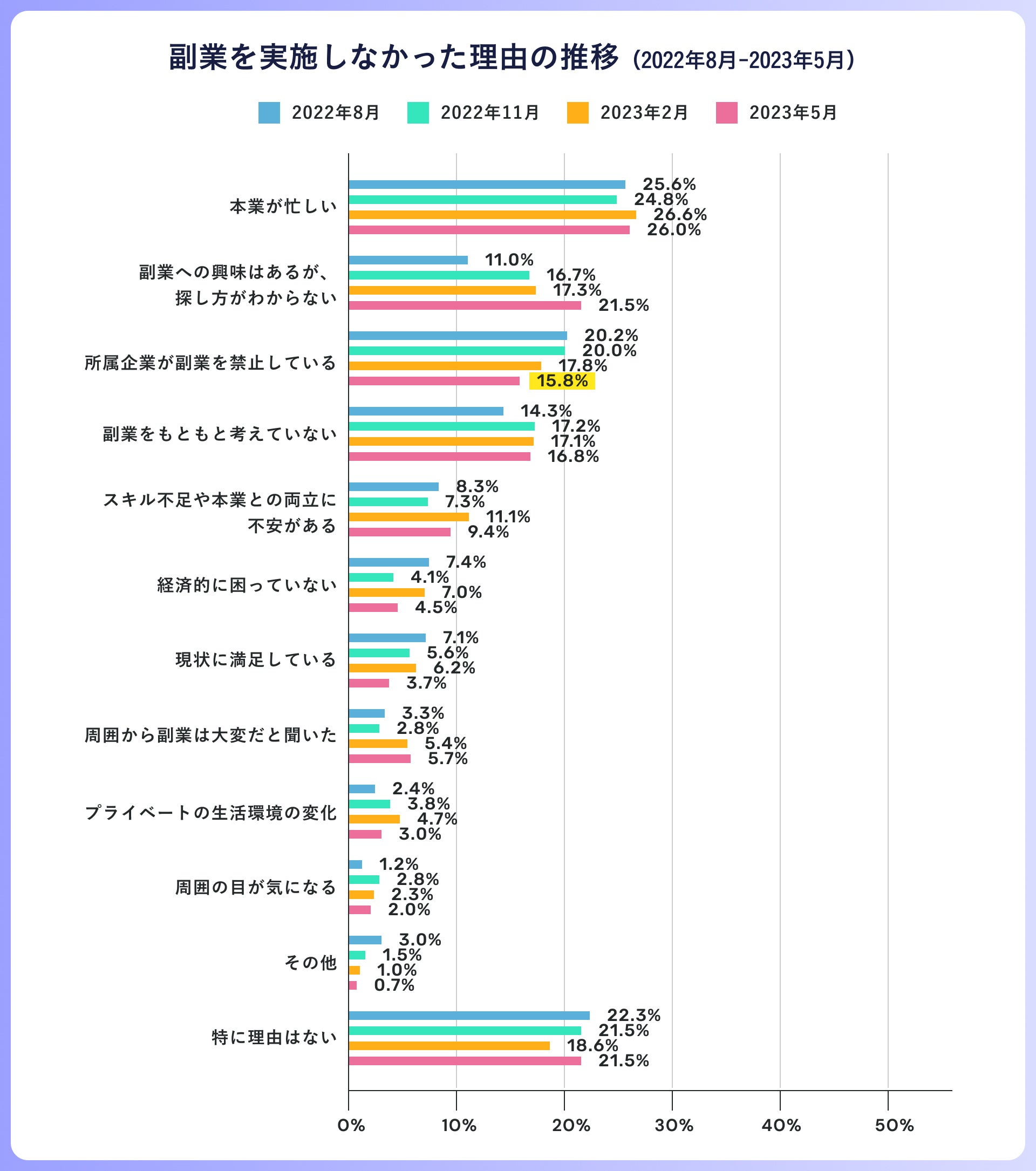 »副業しない理由「所属企業が副業を禁止しているため」は昨年夏から-4.4%減少