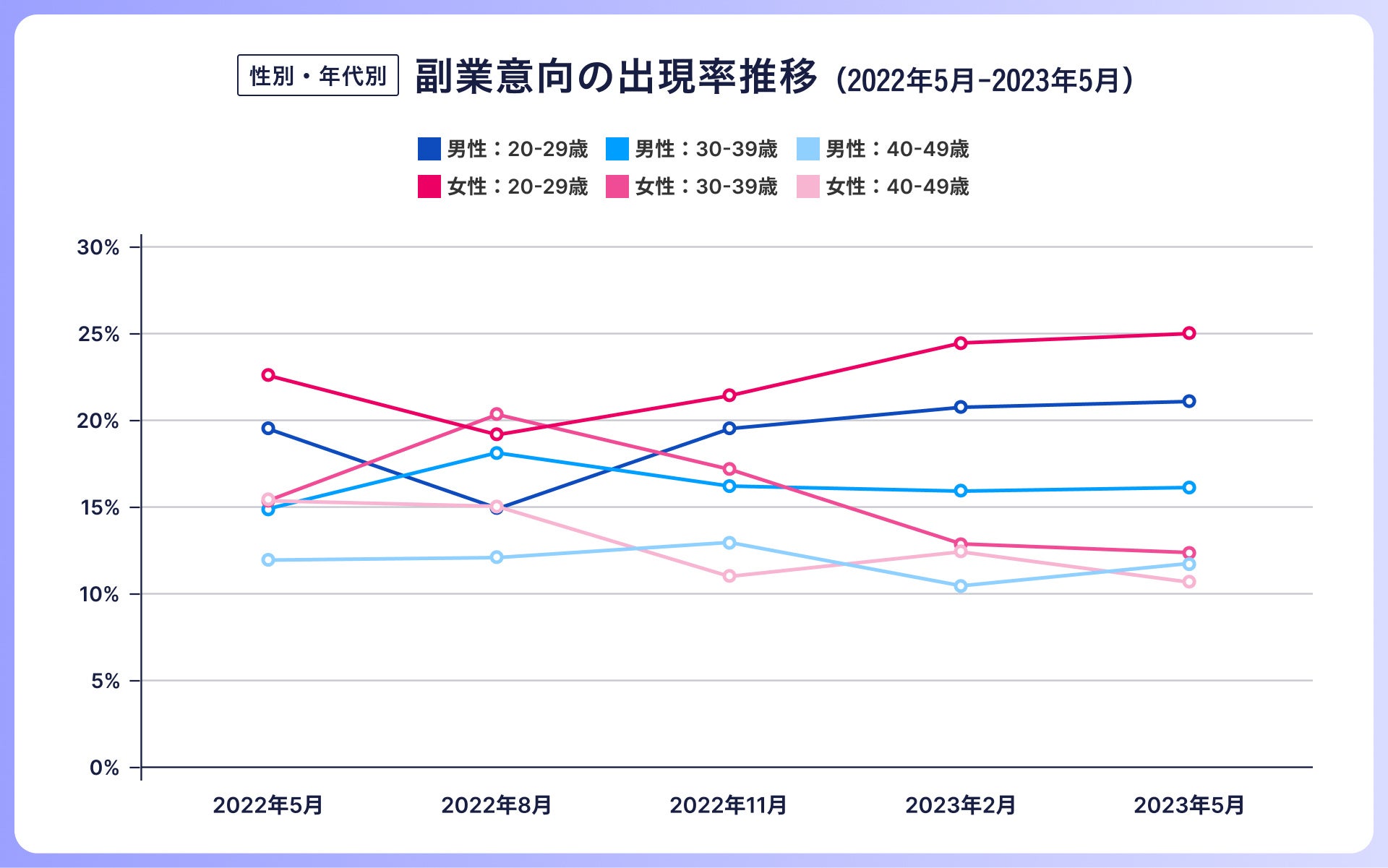 »全体の副業意向は、前回調査よりも減少しているものの、20代男女では上昇傾向