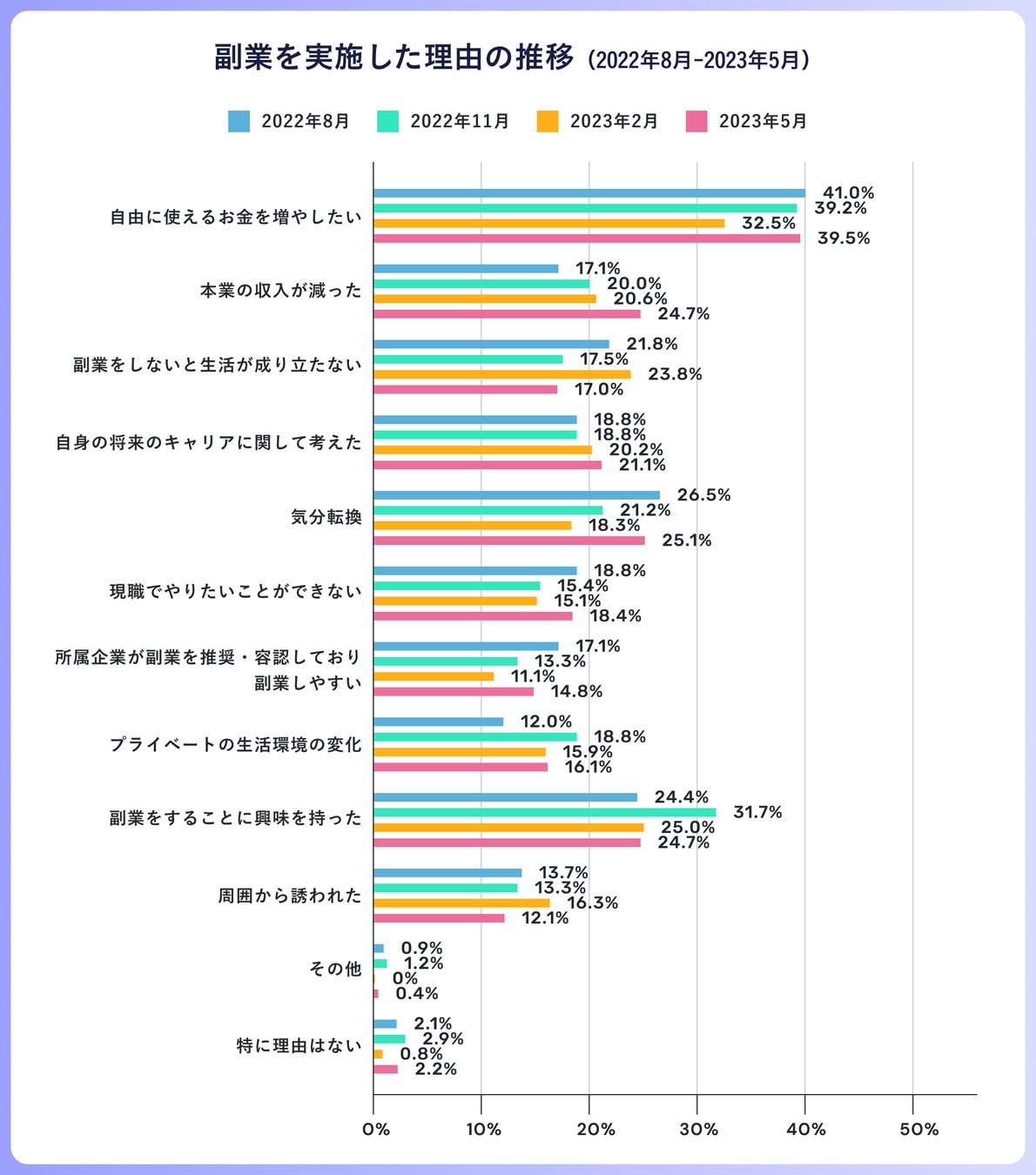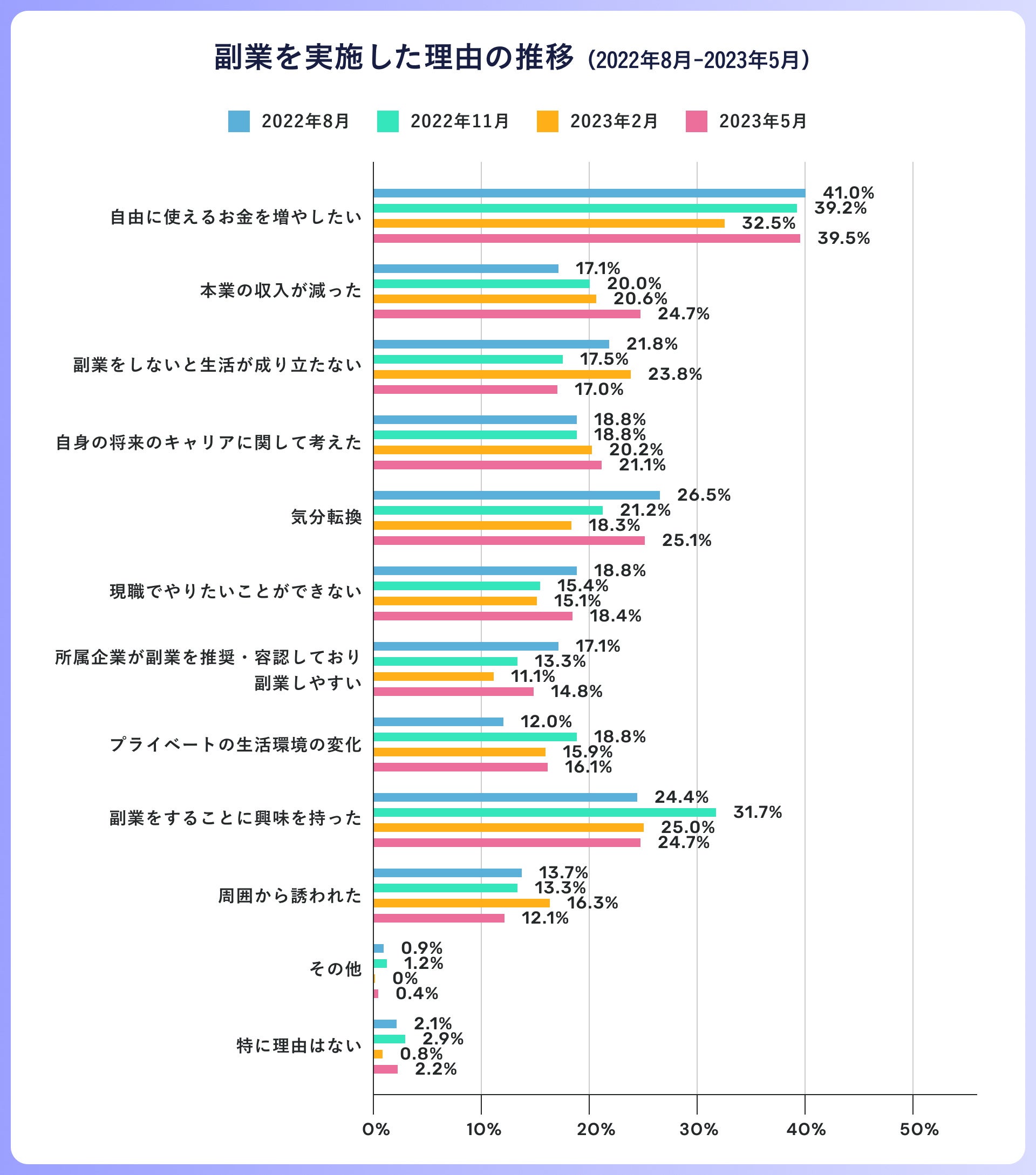 直近半年間に副業を実施した理由を見てみると、「本業の収入が減ったため」が24.7%となり、2022年5月の調査開始から毎回増加していることが分かります。インフレの影響で生活費が高騰したことから収入が減った感覚に陥る方が多いと推測されます。また、「自身のキャリアに関して考えたため」の回答も増加傾向にあります。全体で見ると、引き続き「自由に使えるお金を増やしたいため」という回答の割合が高いです。