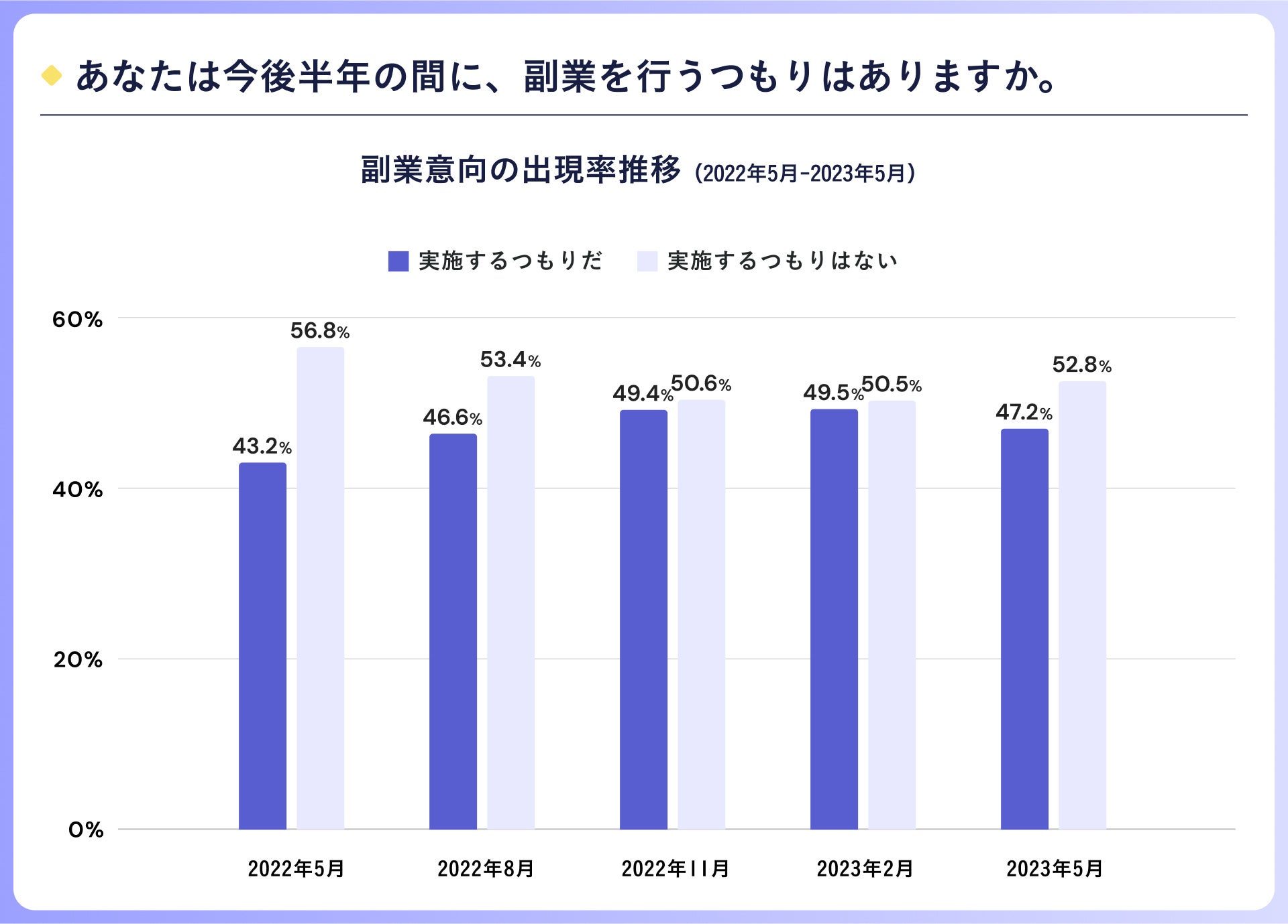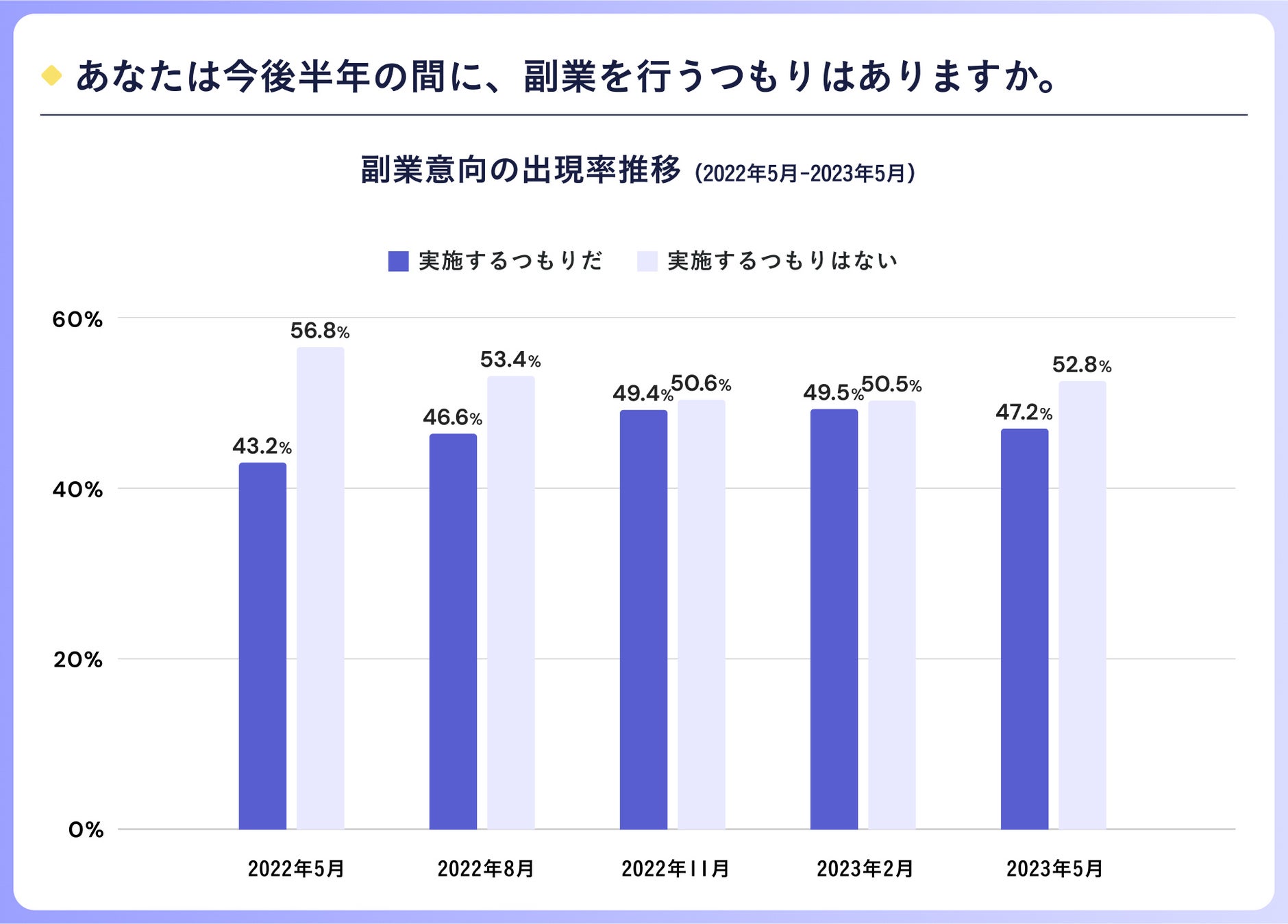 「あなたは今後半年の間に、副業を行うつもりはありますか?」と尋ねたところ、「はい」と答えた方は、47.2%となりました。副業経験者同様、前回の調査(2023年2月実施)と比べると、前回が49.5%だったので減少していますが、前年同月比で見ると43.2%→47.2%と増加しています。また、20代は男女ともに他の年代と比べても副業意向が高く、2022年11月から増加傾向であることが分かります。