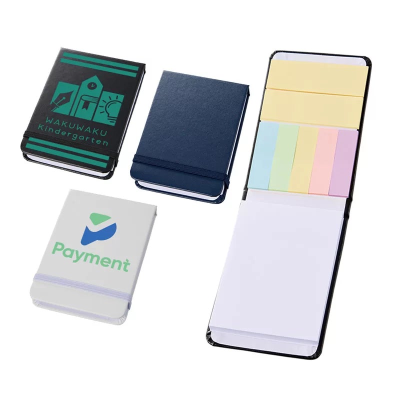 内部には大・中・小の3サイズ付箋(75枚・25枚・25枚)がセットされており、ビジネスシーンから学校現場まで幅広く活用できる実用性が特徴。コンパクトな設計で持ち運びにも便利なため、日常使いしやすいノベルティとして喜ばれるアイテムです。