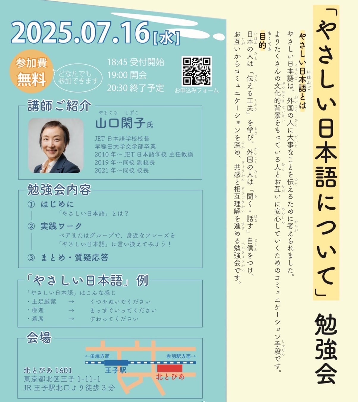 【「やさしい日本語について」勉強会@北とぴあ】7月16日(水)19時~20時30分【Kita@北区立王子駅前公園 】7月26日(土)11時~18時