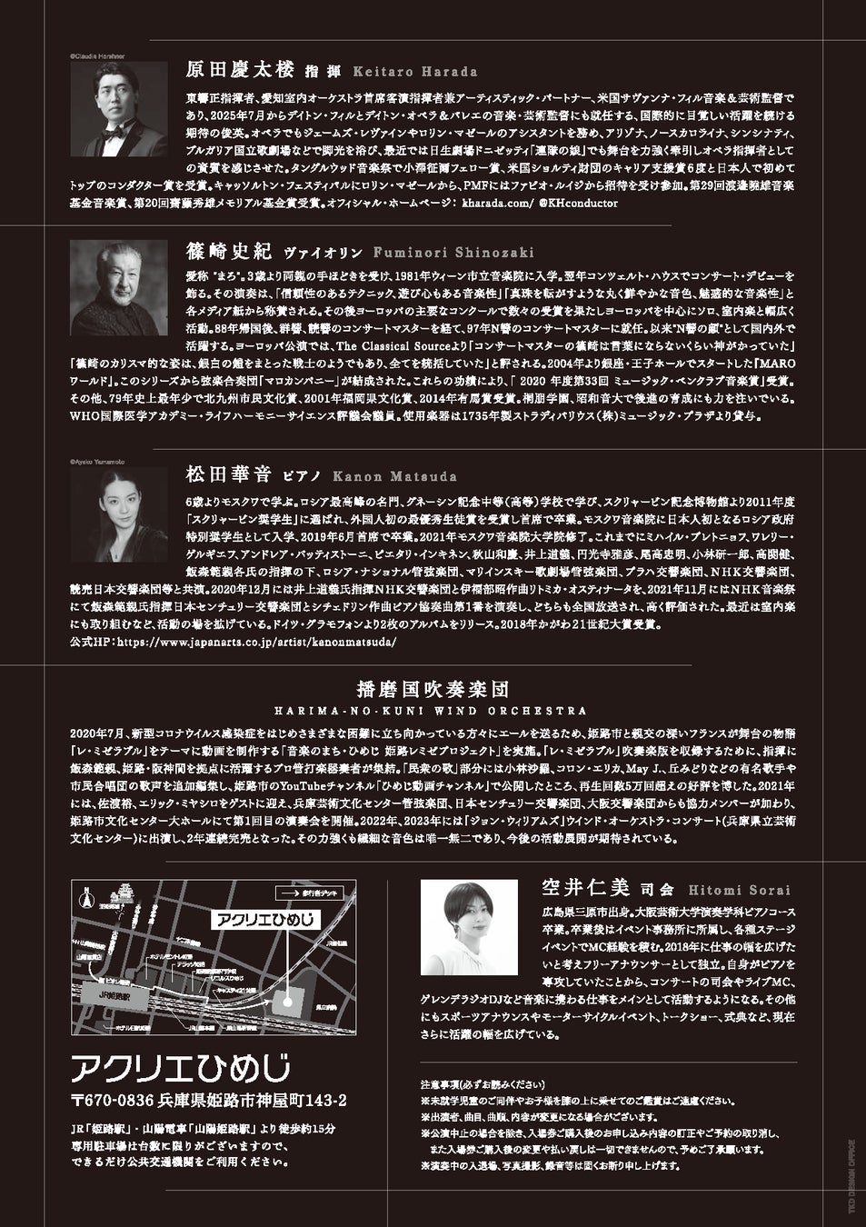 華麗・情熱・自由を奏でるマスター・オブ・ヴァイオリニスト、篠崎“MARO”史紀、本場ロシアで磨き抜かれたピアニスト・松田華音、世界が求める新進気鋭の熱きマエストロ・原田慶太楼らトップアーティストが姫路に集結し、地元姫路から阪神間で活躍するプロ奏者で構成された播磨国吹奏楽団と共演。