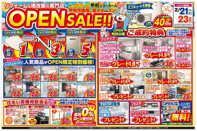 全国100店舗以上を展開する住宅リフォーム専業の ニッカホーム株式会社(本社:愛知県名古屋市緑区篭⼭、代表取締役社長:西田裕久、以下 ニッカホーム)の関東支社は、2026年2月21日(土)、山梨県甲府市国母に「ニッカホーム甲府営業所」を開設いたします。