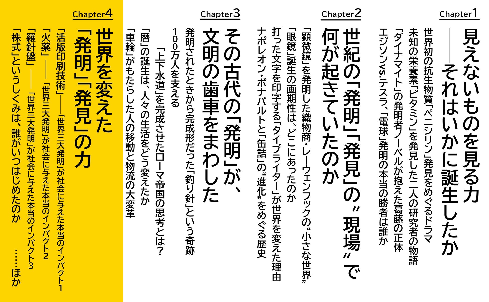 どのように誕生し、なぜ世界の歴史に新たなページを刻むことができたのか――。古今東西の発明と発見の現場に「立ち会う」ことで、世界史に新たな角度から光をあてる一冊。