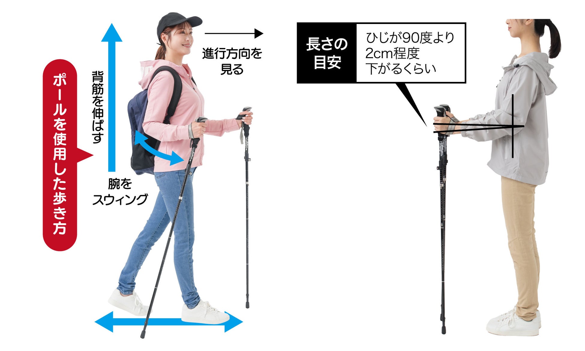 ウォーキングポールを2本使用することにより足腰への負担が軽減されます。また、背筋を伸ばし、正しい姿勢を維持しながら歩くことができます。