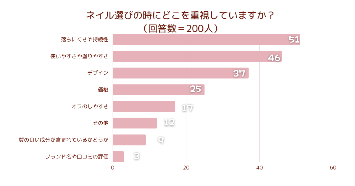 「ネイル選びの時にどこを重視していますか?」とアンケート調査した結果、1位は『落ちにくさや持続性』でした。