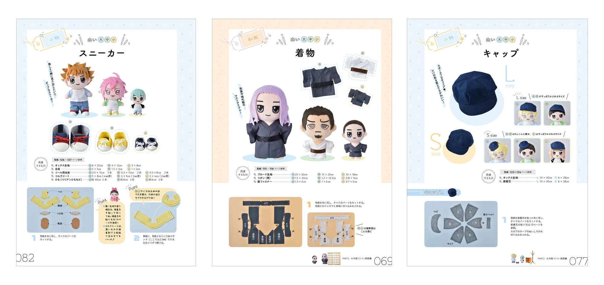 書籍『てづくり推しぬいBOOK』(下部参照)の大・中・小の3サイズのボディに26のアイテムが着せられる、お洋服と小物の作り方本。学園・和服・帽子・スニーカーなど、さまざまなシチュエーションに対応するアイテムを掲載。きっと作りたいお洋服が見つかるはず! 著者はYoutubeやSNSで推しぬいの作り方動画や型紙を公開しているたきゅーとちゃん。わかりやすい解説で、初心者さんも安心です。全てのサイズの型紙付き。