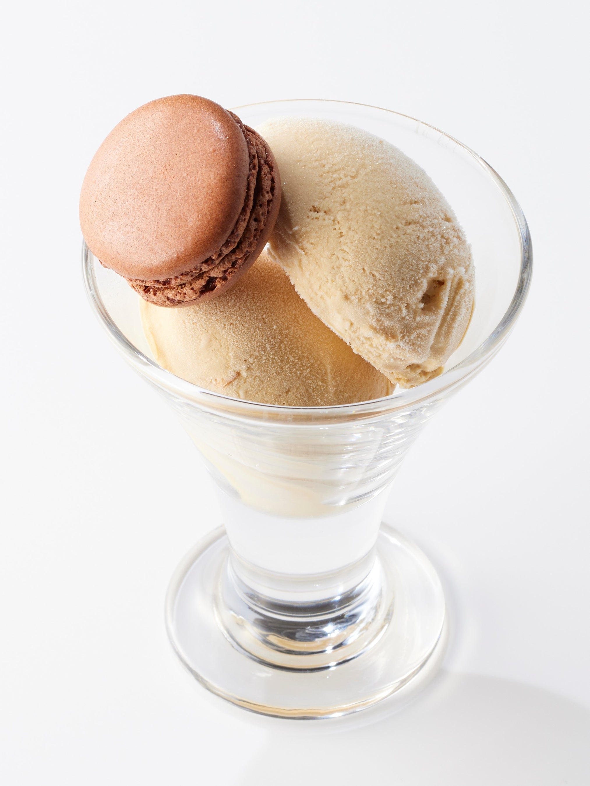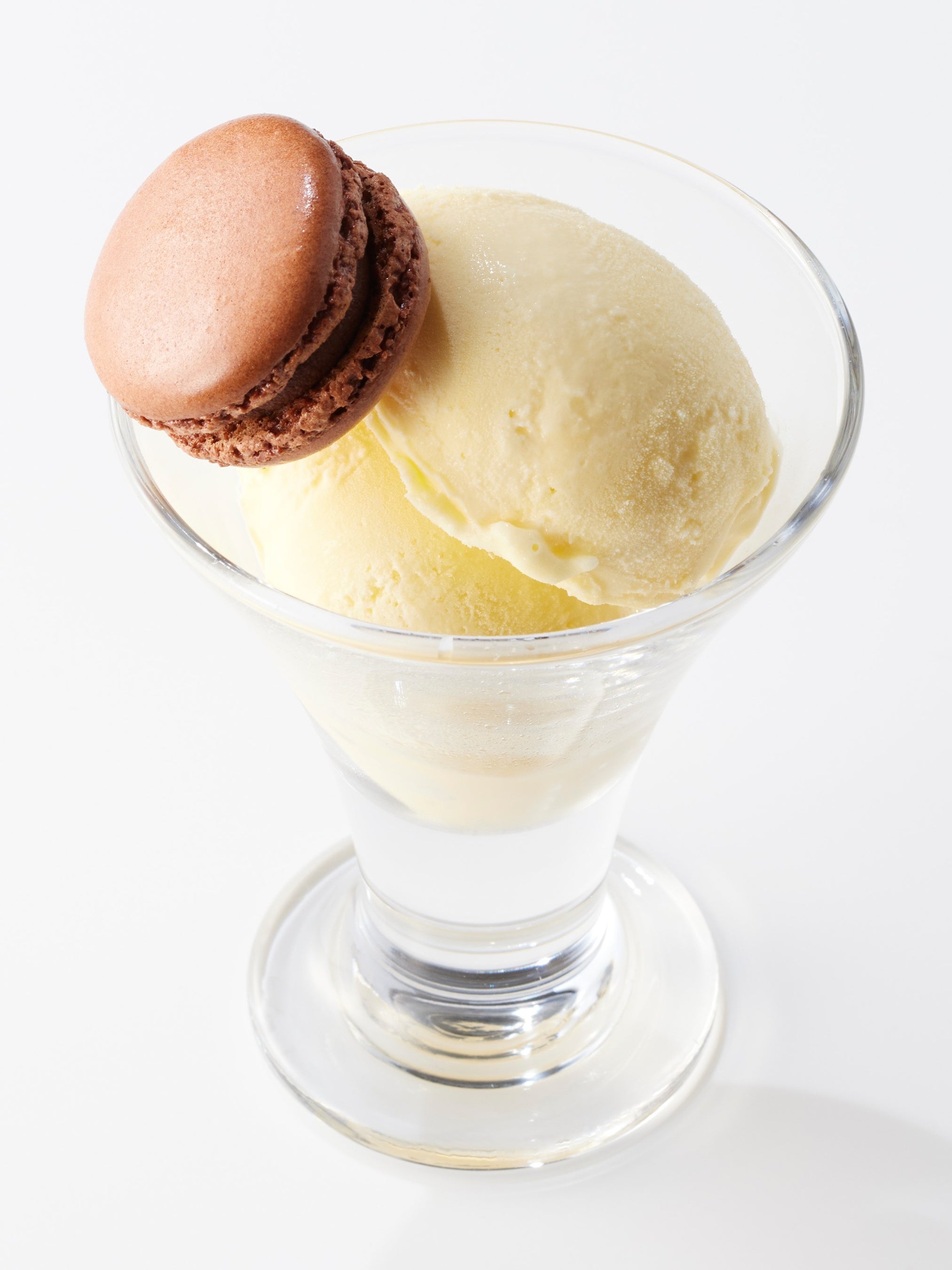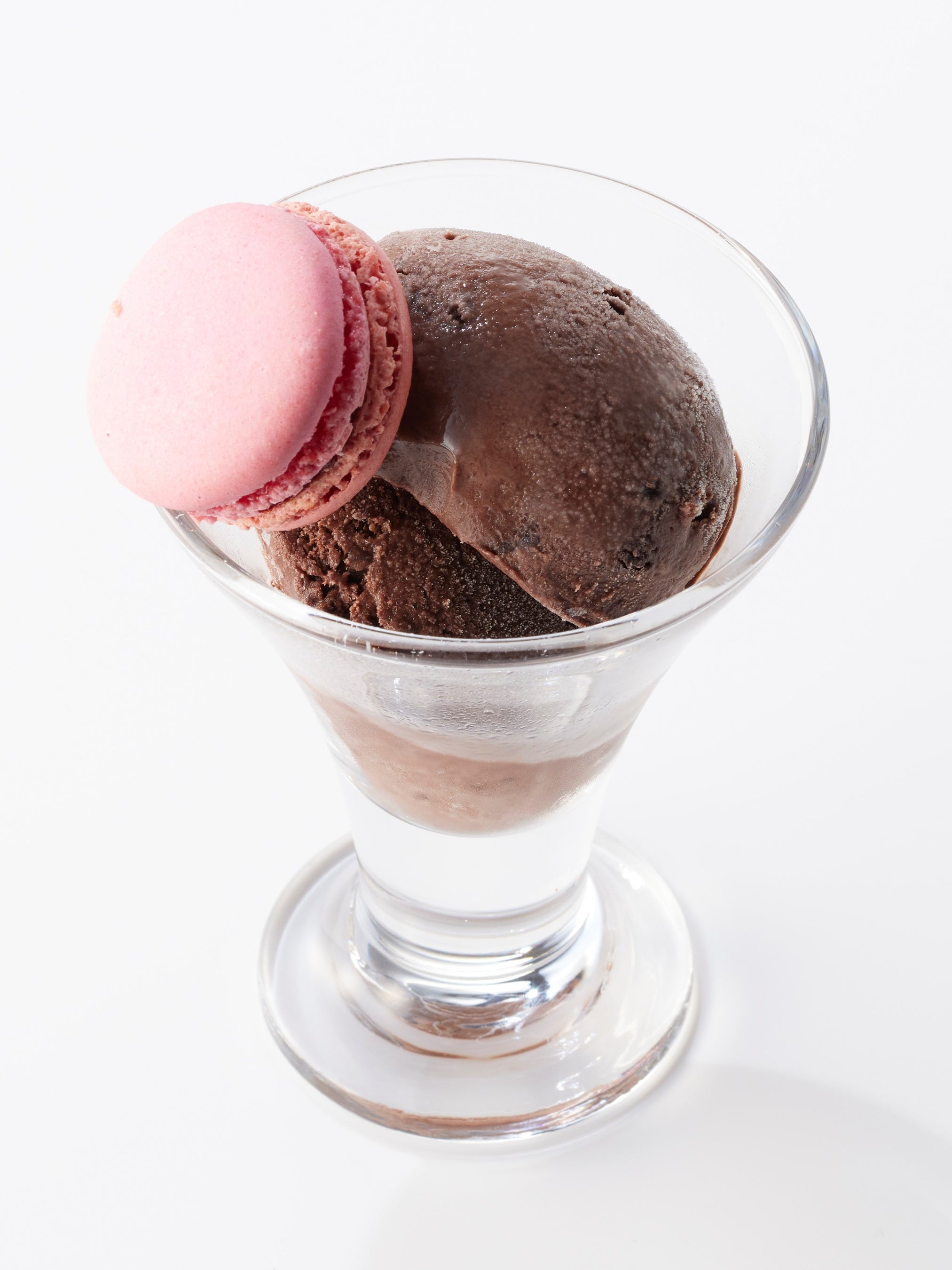 定番のバニラアイスと濃厚な甘みの塩キャラメルアイスにはほろ苦いチョコマカロンを、ベルギー産のチョコレートを使用したビスケット入りのチョコレートアイスには甘酸っぱいラズベリーマカロンを組み合わせました。