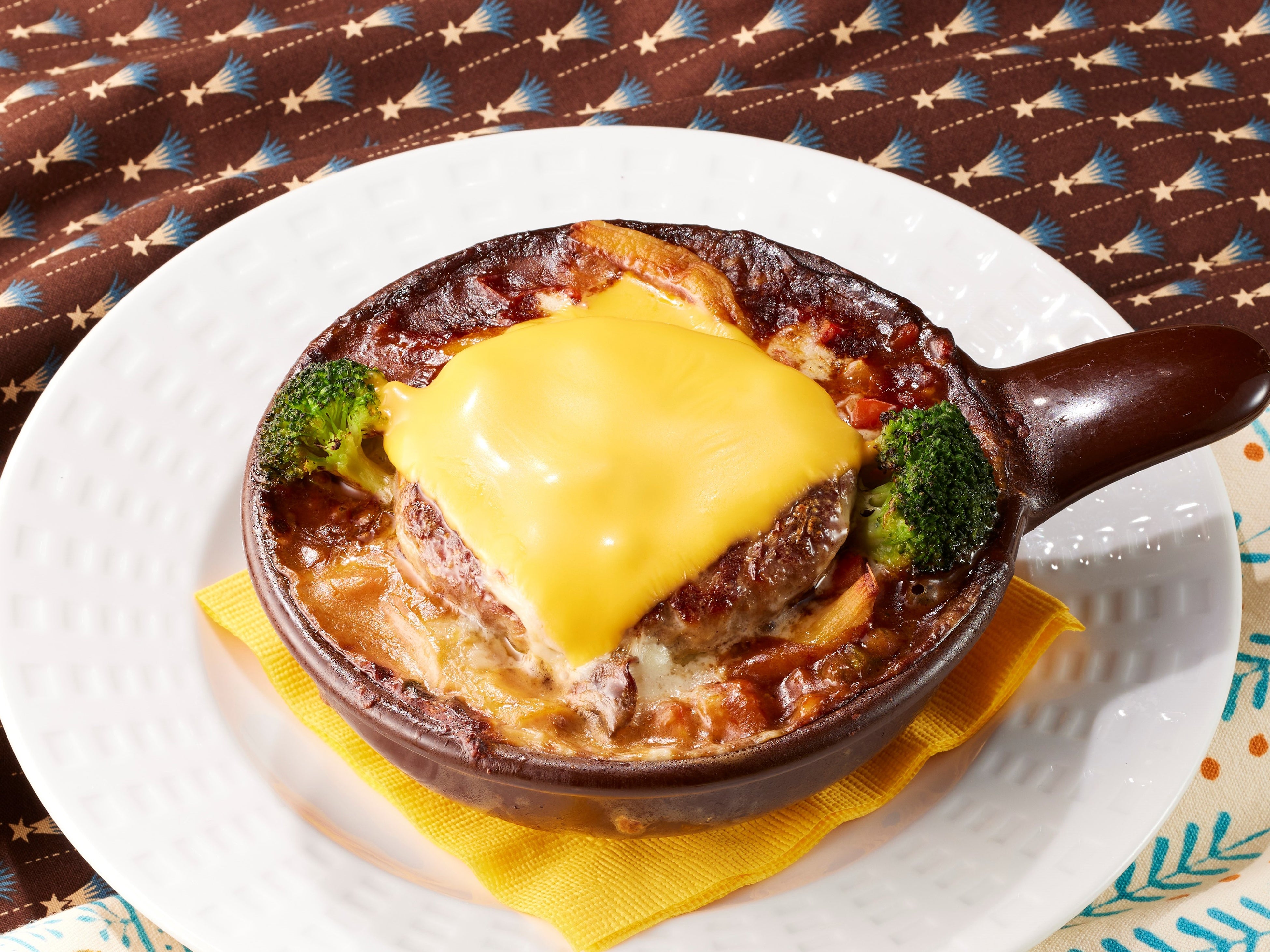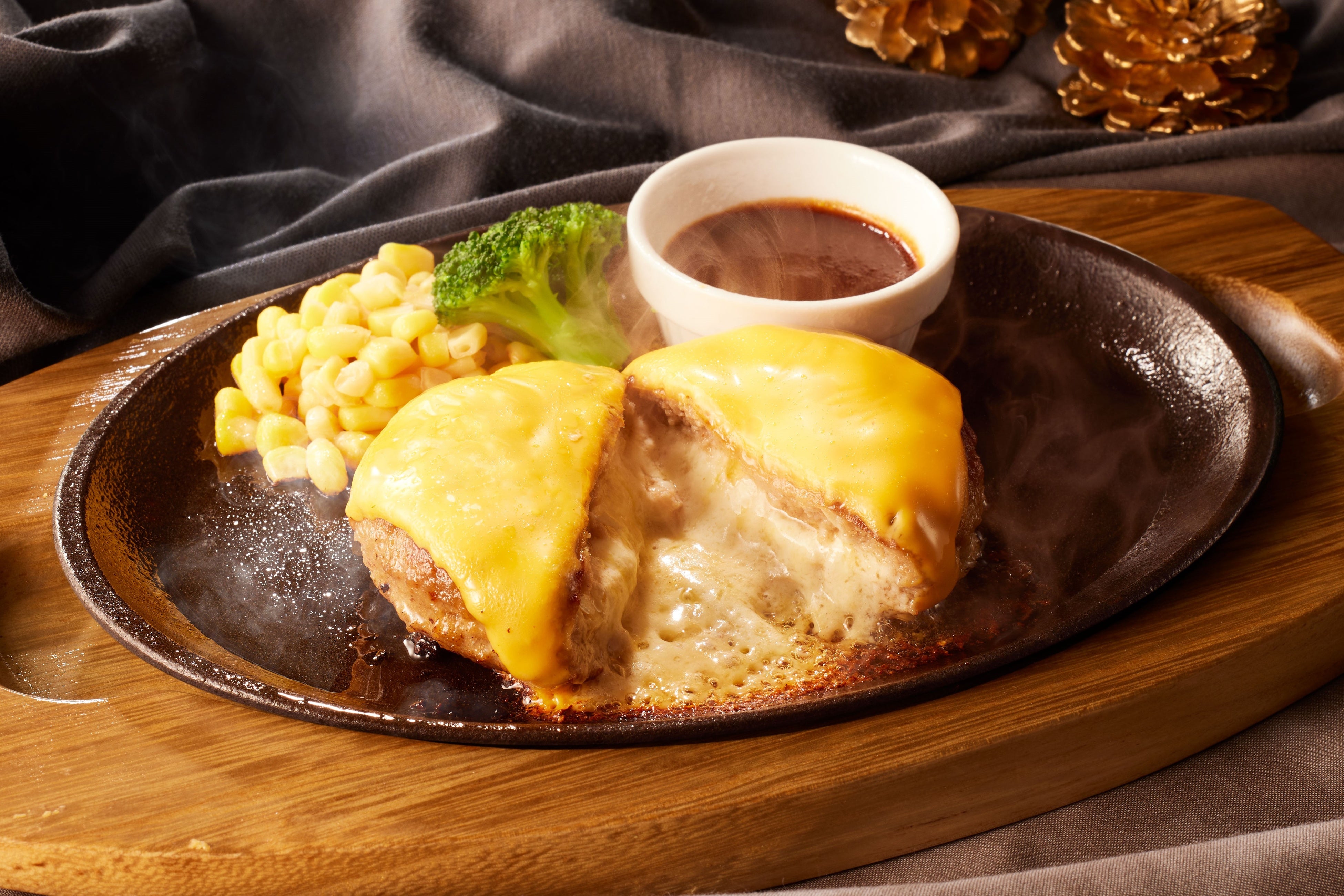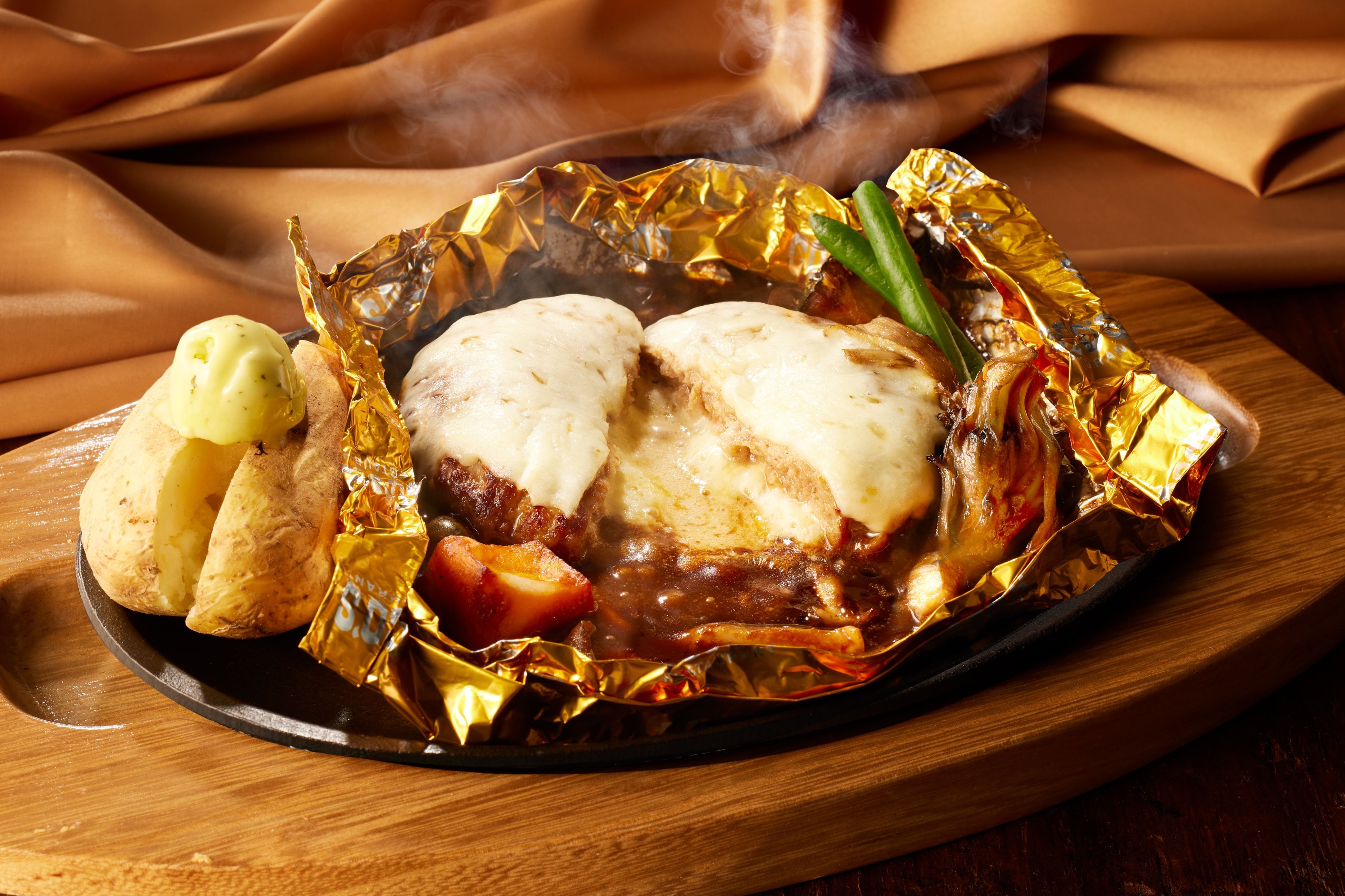 ハンバーグを“チーズインハンバーグ”にブラッシュアップしました。ハンバーグの中には、モッツァレラなどの5種のチーズ、上には、ゴーダとステッペンの2種のチーズを使用した濃厚な味わいの包み焼きハンバーグです。7種のチーズとジューシーなハンバーグのマリアージュをお楽しみください。