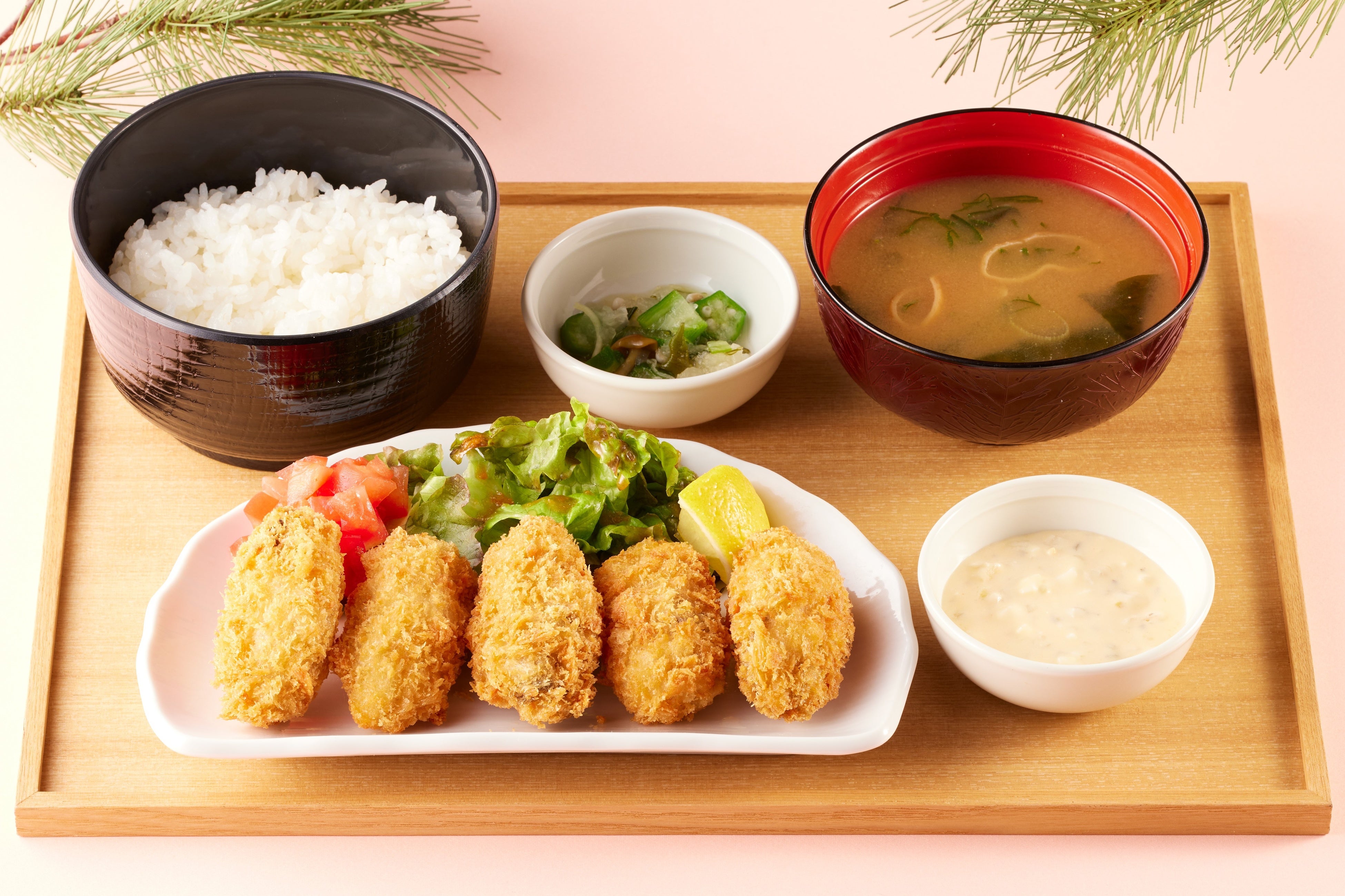 ふっくらジューシーな広島県産牡蠣をお楽しみいただけるこの季節限定の和膳です。ごはんとお味噌汁、季節の小鉢と一緒にお召し上がりください。