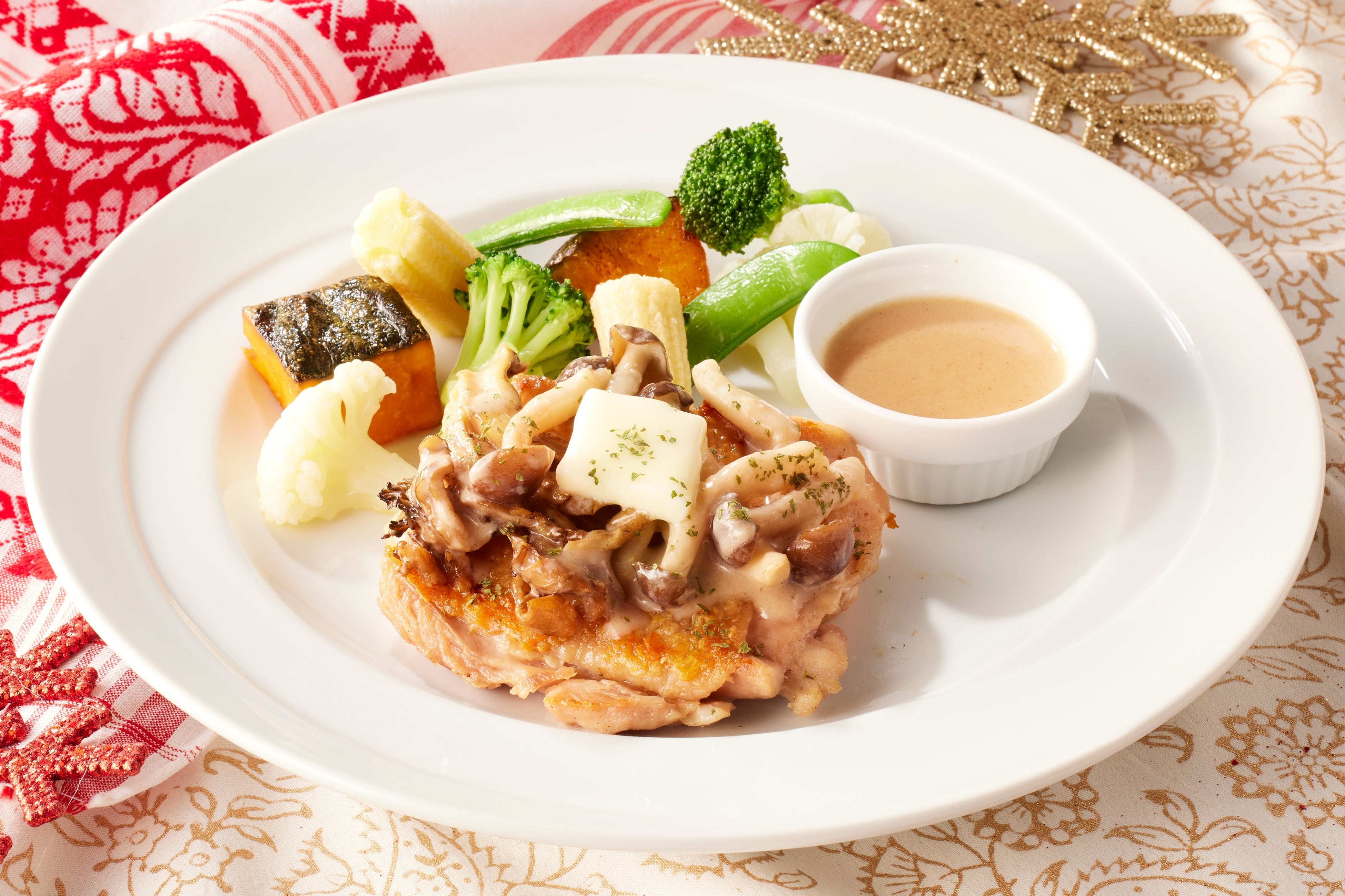 ジューシーな鶏もも肉のステーキを、ポルチーニ香るクリームソースでご堪能いただけます。かぼちゃやヤングコーンなどの温野菜もクリームソースにディップしてお楽しみください。