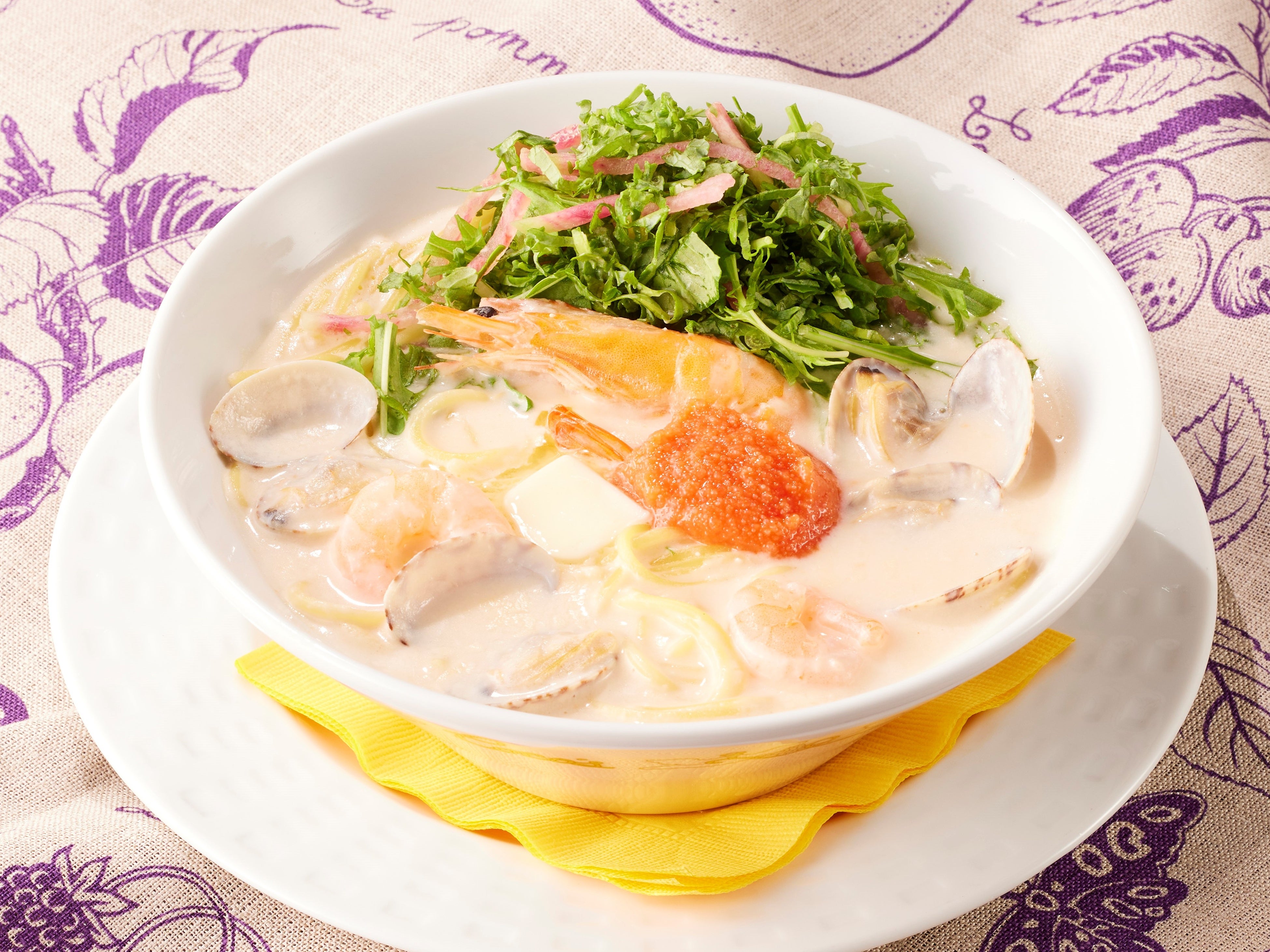 濃厚なクリームスープパスタに、エビ、あさりなどの魚介や、ケールなどのフレッシュな生野菜をトッピングしました。明太子の旨みが溶け込んだスープのクリーミーな味わいと生野菜のシャキシャキ食感をお楽しみください。