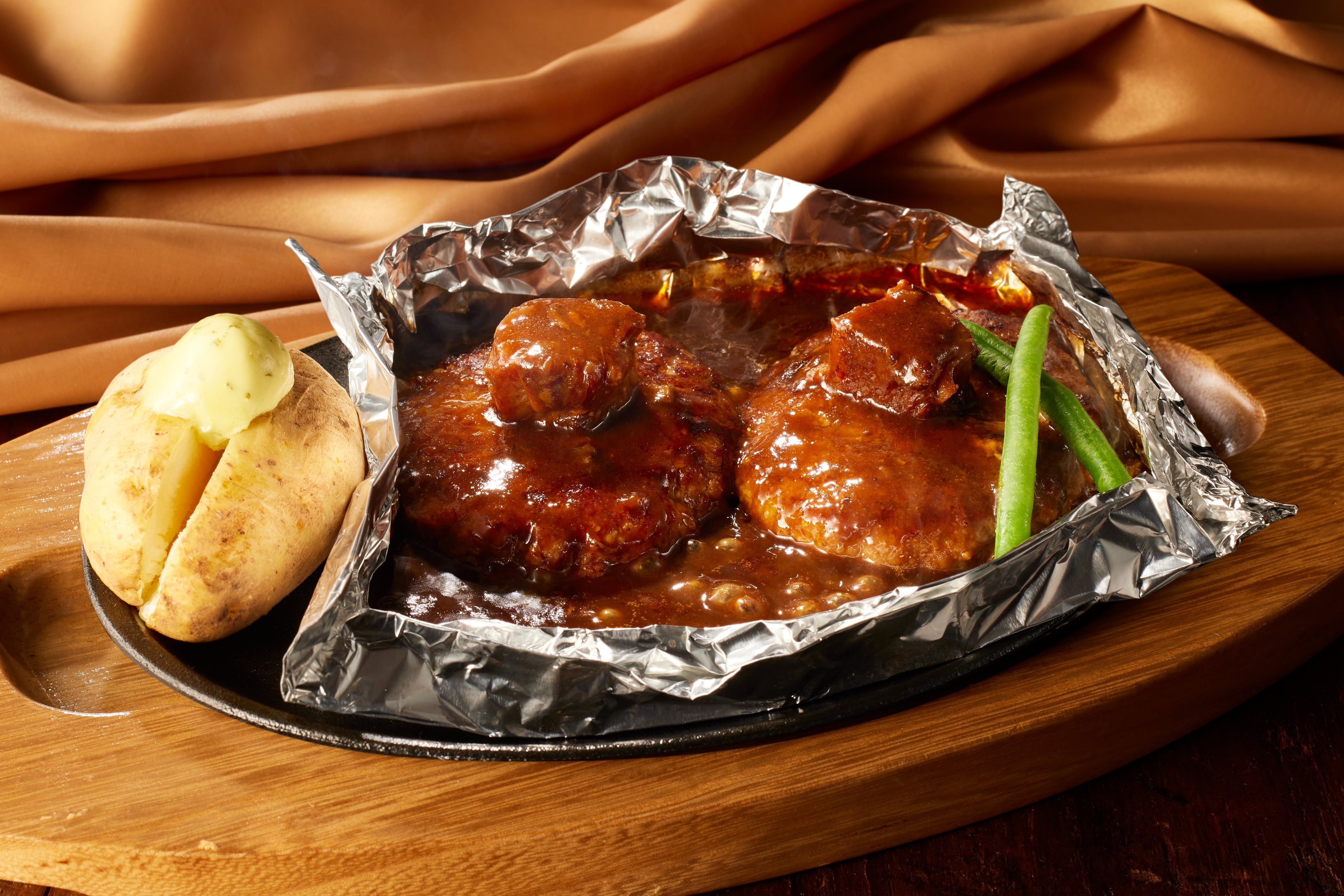 人気商品「濃厚ビーフシチューの包み焼きハンバーグ」をハンバーグ倍量(110g×2個)で提供します。お腹いっぱい食べたい時はもちろん、2人で1個ずつシェアするのにもぴったりです。