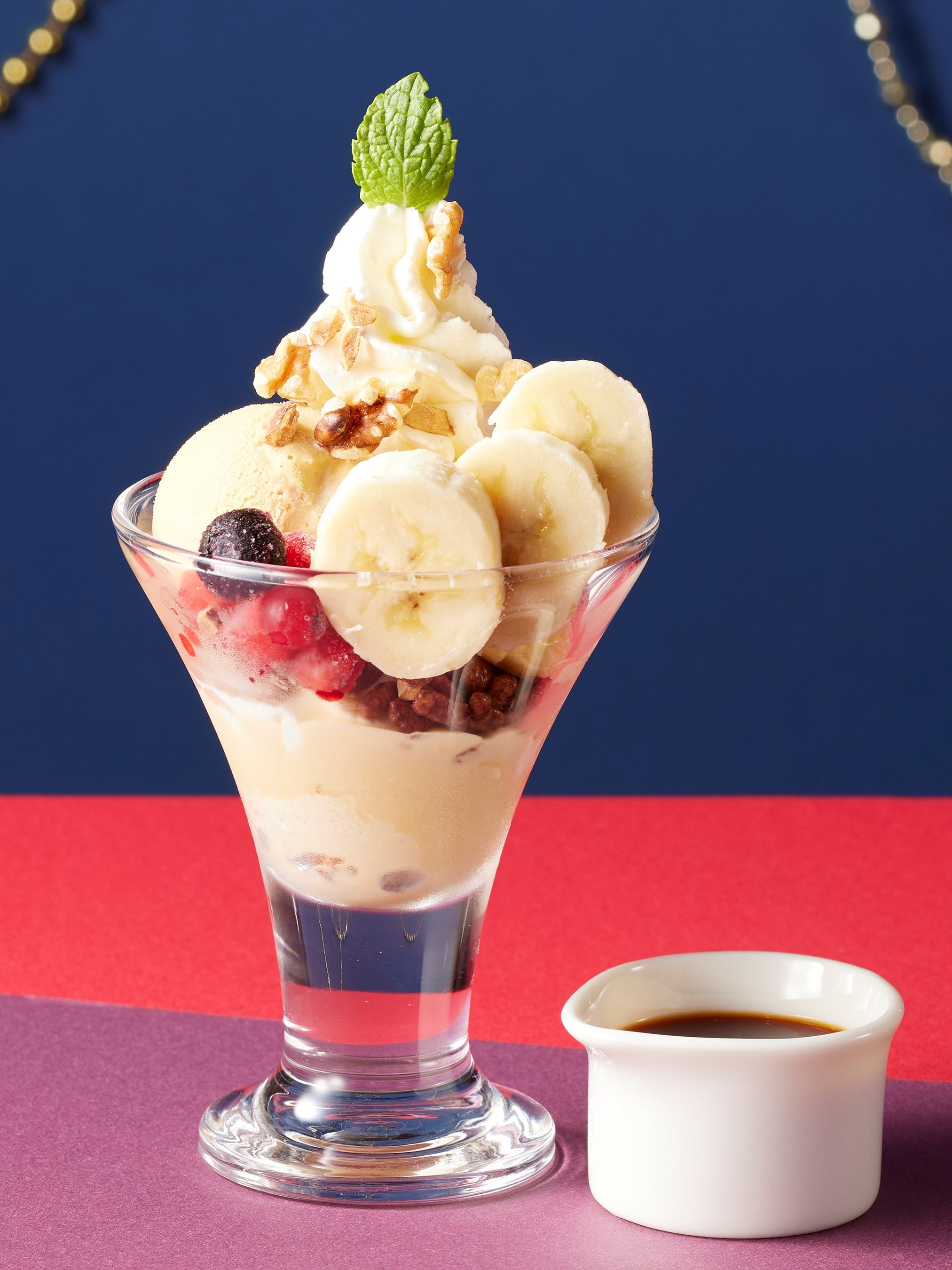 キャラメルのこっくりとした甘みの中にほどよい塩味を感じる塩キャラメルアイスを使用。バナナ、香ばしいローストミックスナッツ、甘酸っぱいフローズンミックスベリー、別添えのホットキャラメルソースと一緒にお楽しみください。