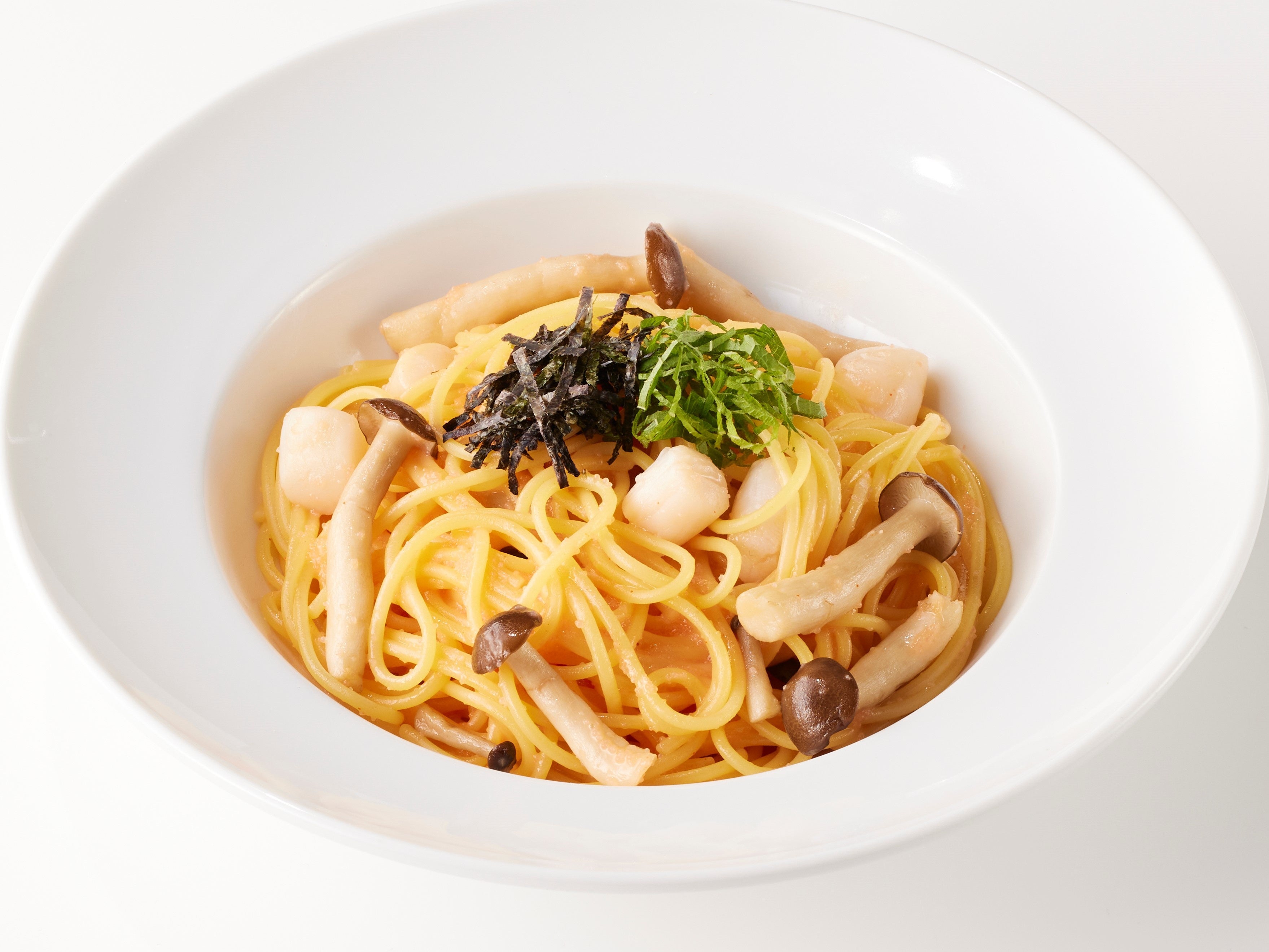 粒々食感がクセになる明太子パスタに、しめじとぷりぷりの小柱を組み合わせました。刻み海苔と大葉で香り高い一品に仕上げています。