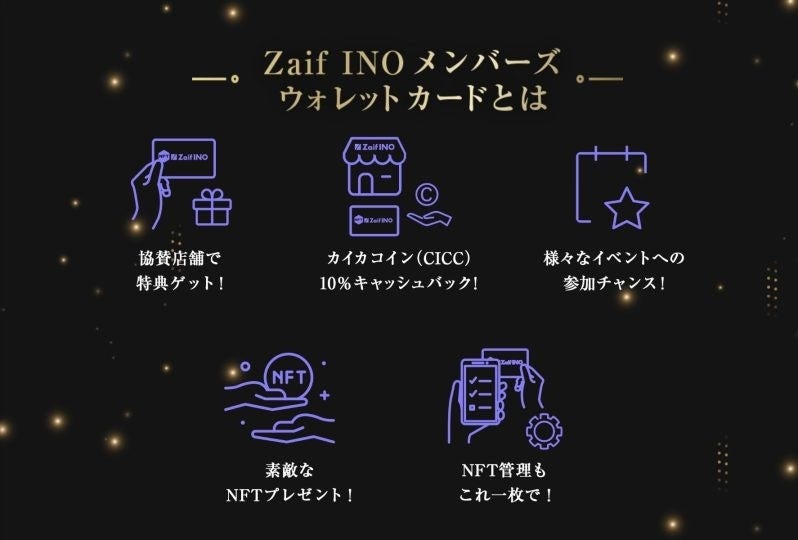 Zaif INOメンバーズウォレットカードを協賛店舗に提示頂くとおトクな特典をGETできる他、Zaif INOでのNFT購入代金の10%相当分のキャッシュバック、オフ会参加申し込み券、NFTプレゼントなど様々な特典付きです!