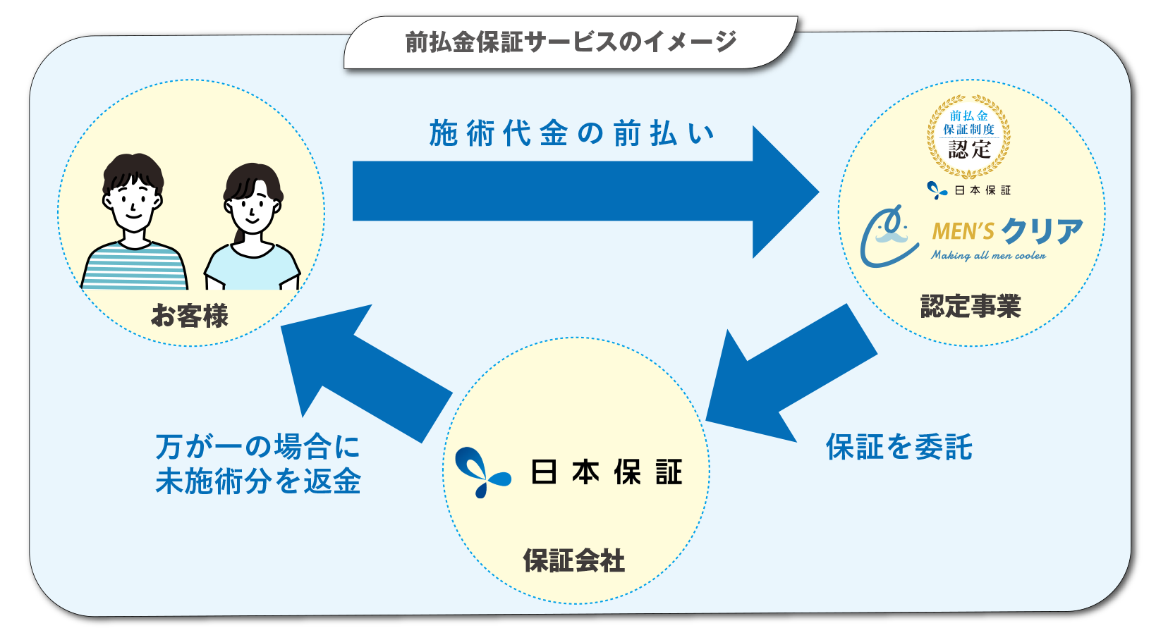 メンズクリアは、株式会社日本保証より「経営および財務状況が健全である」と正式に認められ「前払金保証」サービスを導入いたしました。 お客様により安心してご契約・施術を受けていただけるよう、 万が一、脱毛サロンが倒産してしまった場合でも、お客様の未消化分の施術料金を保証*⁵する制度です。なお、現時点で当社の経営に問題はなく、今後も安定したサービス提供を継続してまいります。