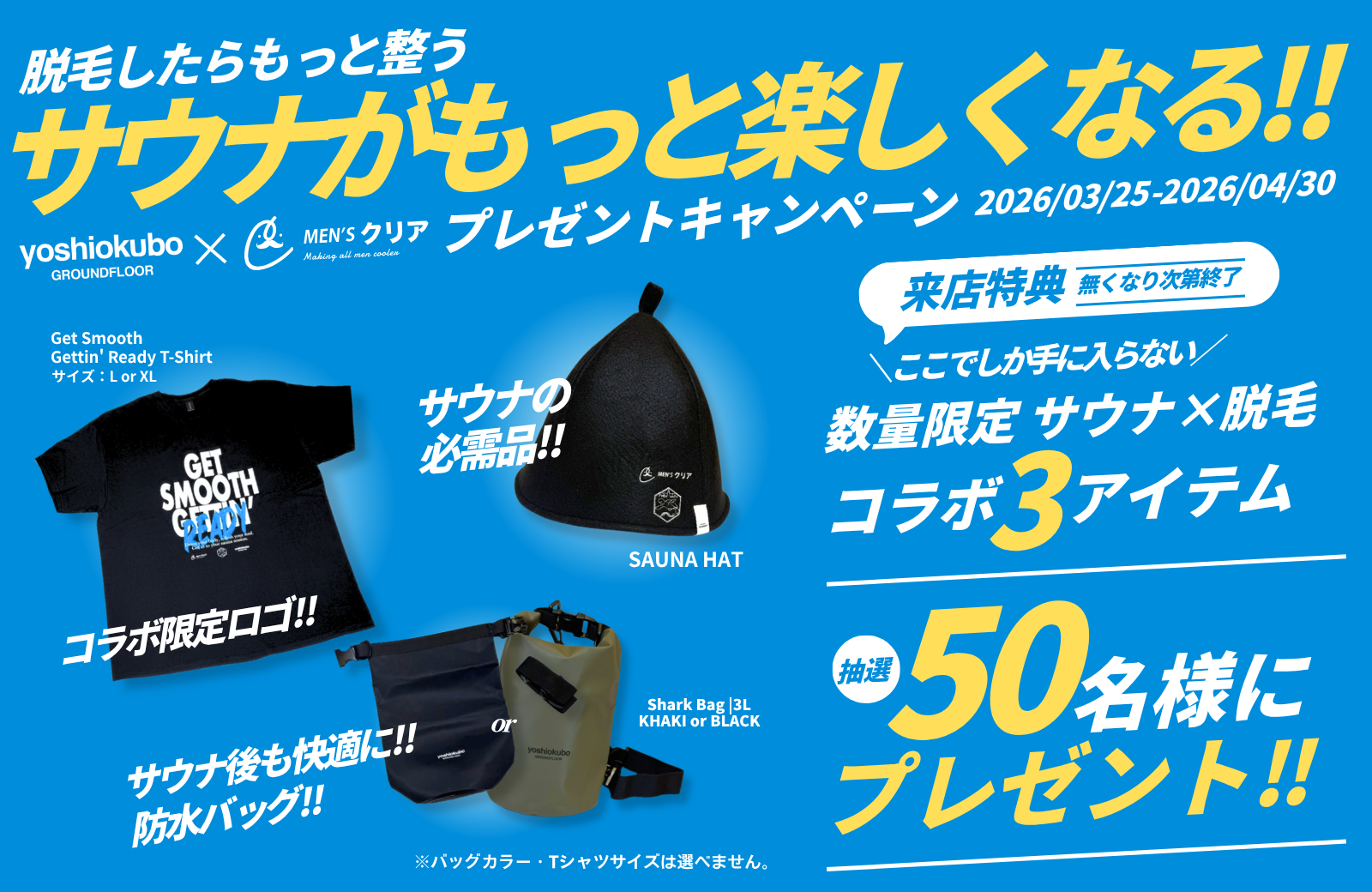 株式会社クリア(本社:東京都渋谷区、代表取締役社長:市川 智久)が運営するメンズ脱毛サロン「メンズクリア」は、ご新規様限定で、2026年3月25日(水)から2026年4月30日(木)までの期間、全国のメンズクリアにおいて、アパレルブランド「yoshiokubo」とのコラボサウナアイテムを抽選で50名様にプレゼントするキャンペーンを開催いたします。