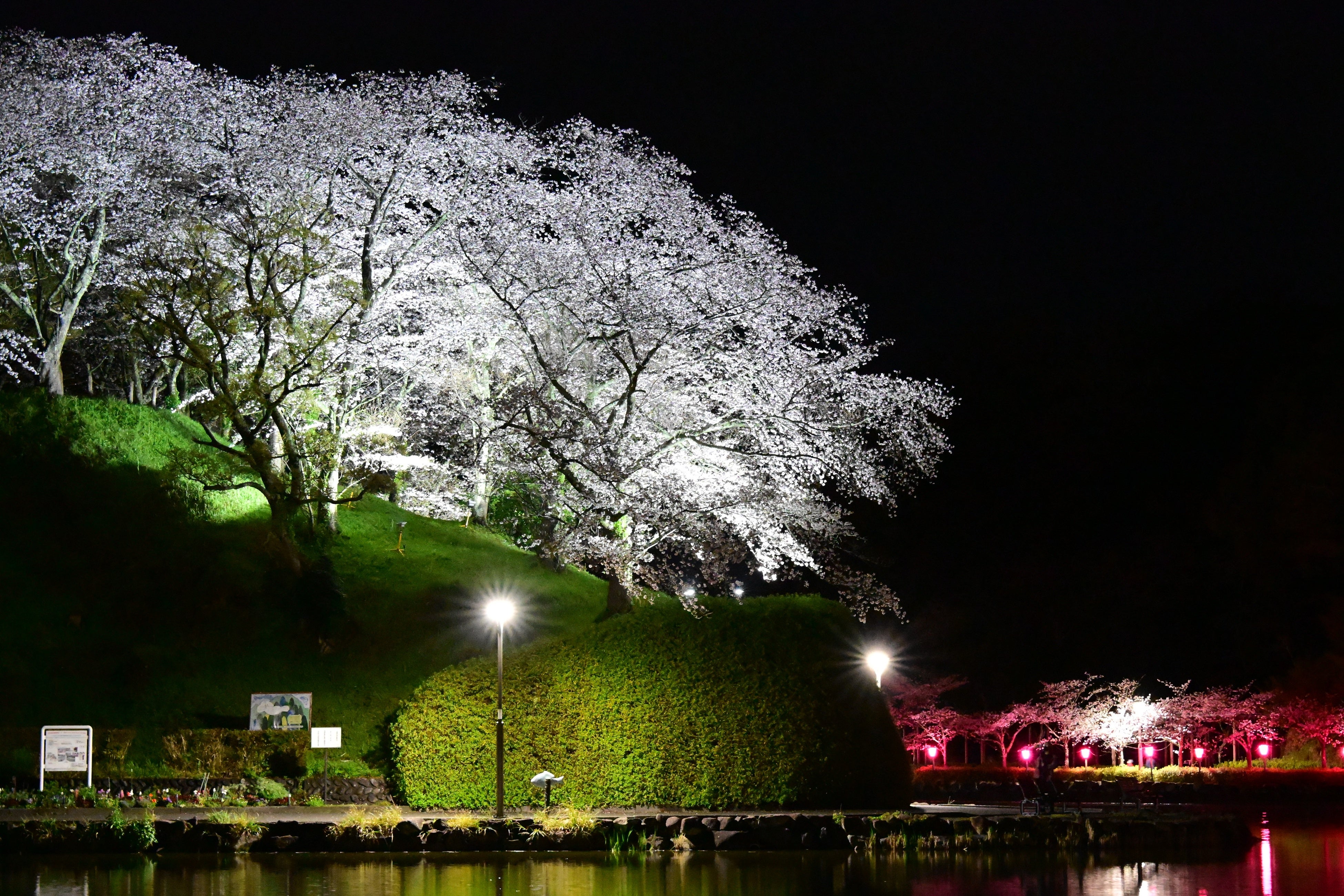 ・蓮華寺池公園の正面の桜がライトアップされ、来園者を魅了します。