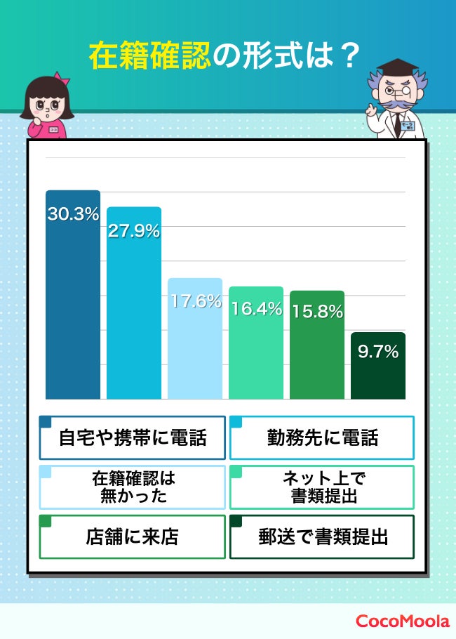 在籍確認の方法は「自宅や携帯に電話」や「勤務先に電話」といったパターンが多い。一方で、「在籍確認は無かった」と答えた方も約18%存在する。