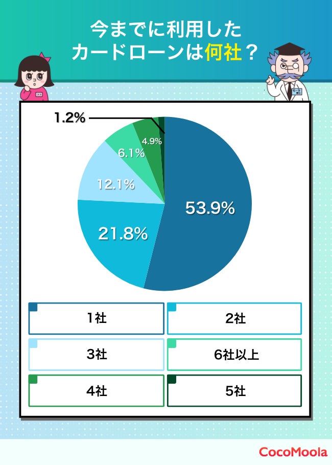 カードローンの利用は「1社のみ」が最も多く約54%。次いで「2社」が22%、「3社」が12%。