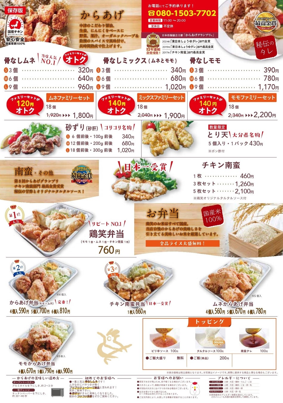 「鶏笑」は、日本、海外に店舗展開するからあげ専門店で、からあげの聖地である大分県中津の本場唐揚げを販売しています。からあげグランプリでは、しょうゆ唐揚げ部門と、チキン南蛮部門の2部門で最高金賞を受賞し、しょうゆ唐揚げ部門では、13年連続で金賞を受賞しています。