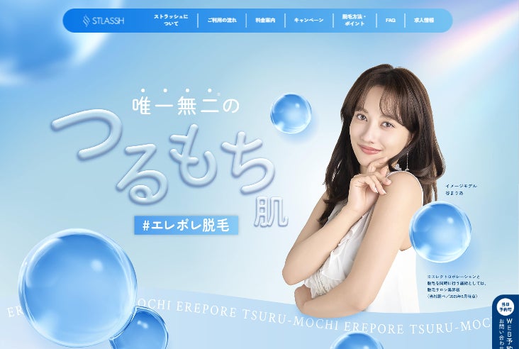 トップページでは、WEBCMと連動した“うるおいのシャボン”を繊細にあしらい、エレポレ脱毛で目指す「うるおいをまとったつるもち肌」を視覚的に表現。柔らかなブルーを基調に、余白や光の入り方まで統一することで、ブランド全体の透明感と軽やかさがより鮮明に伝わるサイト構成となっています。また、谷まりあさんの新ビジュアルを随所に配置し、見るたびに気持ちがふっと明るくなるような“肌にやさしい脱毛体験”をイメージしています。