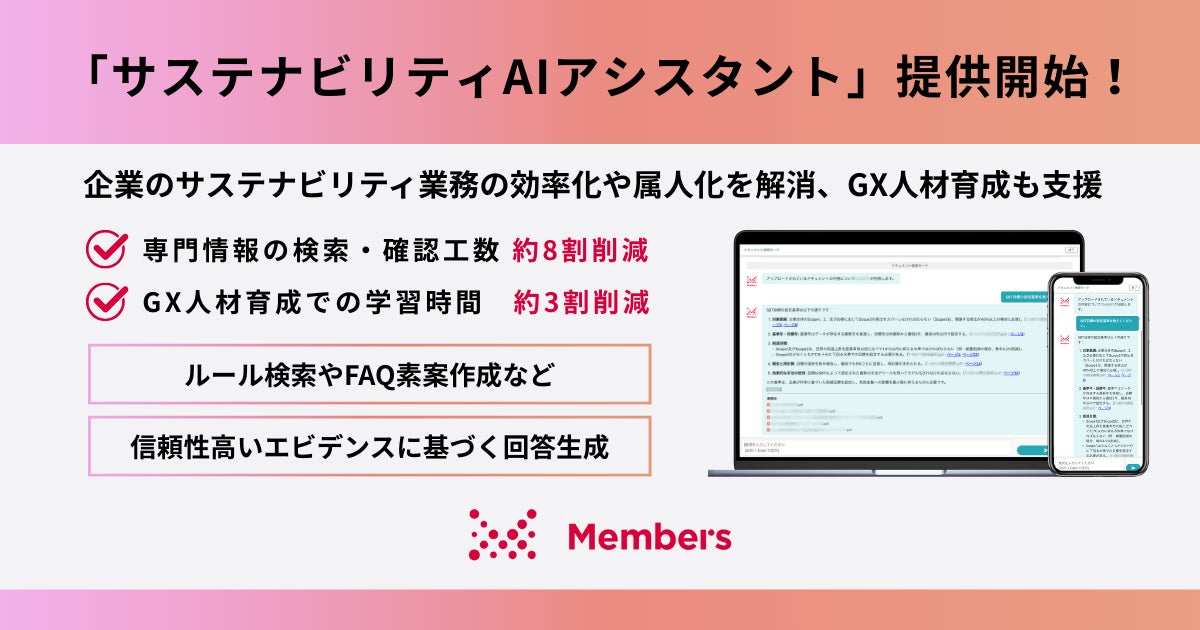 DX現場支援で顧客と共に社会変革をリードする株式会社メンバーズ(本社:東京都中央区、代表取締役社長:髙野 明彦、東証プライム:2130、以下「メンバーズ」)は、企業のサステナビリティ業務の効率化や属人化解消、GX人材育成活用をサポートする「サステナビリティAIアシスタント」の提供を2025年3月より開始します。