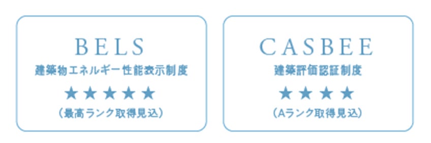 ○建築物の省エネ性能及び環境性能の評価制度である「BELS(建築物エネルギー性能表示制度)」最高ランク5★及び「CASBEE建築評価認証制度」Aランクの取得を予定しています。今後のBIZCOREにおいても、脱炭素、環境配慮といった観点から、環境認証の取得を推進します。