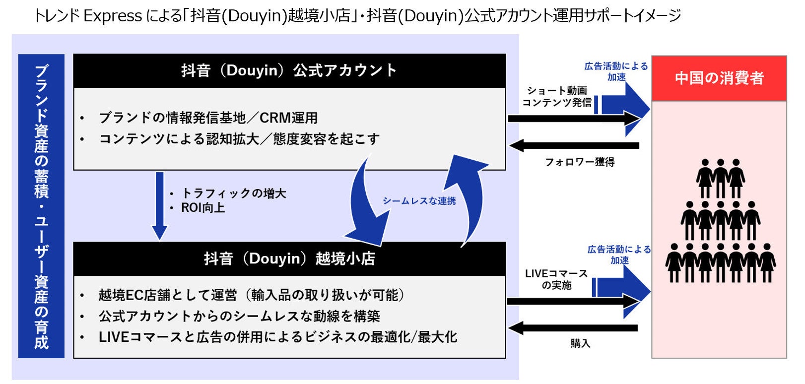ホットリンクグループで、中国を中心とする消費者ビッグデータをベースにクロスボーダーマーケティング及び越境EC事業を行う株式会社トレンドExpress(東京都千代田区、代表取締役社長CEO 濱野智成、以下:トレンドExpress)は、短尺動画プラットフォーム「抖音(Douyin)(読み:ドウイン)」が手がける越境EC「抖音(Douyin)越境小店」への出店支援を本格開始いたします。「抖音(Douyin)」の公式アカウント運用や各種プロモーションとあわせ、日本企業の「抖音(Douyin)」を活用した中国マーケティングを総合的に支援してまいります。