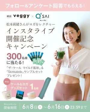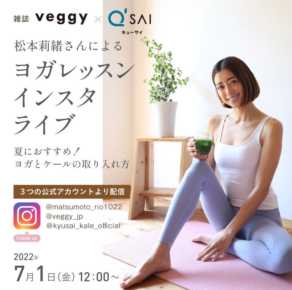 キューサイ株式会社(本社:福岡市中央区、代表取締役社長:佐伯 澄)は、日本初のプラントベースマガジン「veggy(ベジィ)」とコラボし、女優でヨガインストラクターとして活躍中の松本莉緒さんによるインスタライブでのヨガレッスンを7月1日12:00より開催いたします。ライブ内では、松本莉緒さんによるおうちでできるヨガのレクチャーのほか、ヨガ後におすすめのケールの取り入れ方をご紹介します。「ヨガとケールでキレイになりたい」という方にぴったりのイベントになっておりますので、ぜひご参加ください。