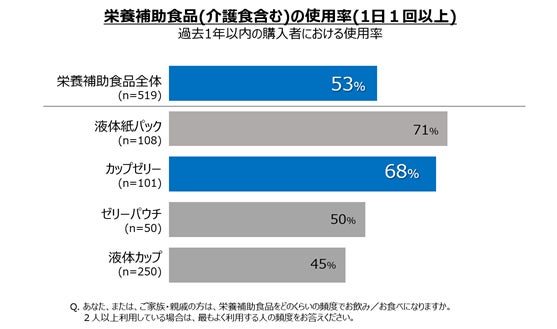栄養補助食品(介護食含む)の過去1年以内の購入者が「1日1回以上」栄養補助食品を使用している割合は、栄養補助食品全体では5割以上、なかでも「カップゼリー」の使用率は約7割です。